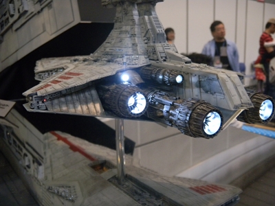 Left: A flickering light gave the image of a welder working on this TIE Fighter in the hangar. Can TIE Fighters really land on those solar panels, though? They're shown in the movies to be stored on racks. The Star Wars books and comics show them landing on the panels though, and it seems impractical as to how the pilots can get down from such a height. Right: The minute detail on this Death Star under construction was amazing, especially with the lights. I took several pictures of this, but most turned out out of focus, unfortunately.