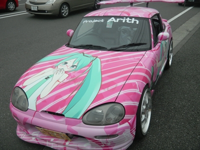 Left: This Miku car was parked out in front of the event. Right: The Twin Messe, where the event was held.