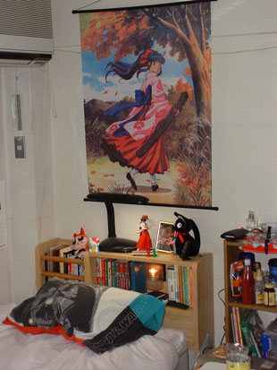 My apartment is real small, but I really love it. I guess I don't need a lot of space since I'm single, but I wouldn't mind a little more space. Still, I don't mind it. It's kinda fun living cramped. I'm a firm believer in having plenty of neat stuff. My neighbors and friends are jealous of the cool setup I have. I have a really swanky Panasonic stereo that can play up to 5 CDs and 5 MDs. I bought a spiffy Toshiba flatscreen TV. When I went back to America for New Years I bought a Toshiba DVD player for only $200 at Amazon.com and took it back with me to Japan. Right now I have my two Dreamcasts lined up on top of my coffee table (my American one and my Sakura Taisen Japanese one), along with my Playstation Saturn, and Super Nintendo. Although my friends like to make fun of me for being such a video game otaku, they like to come over and play my video games even more. We have Marvel vs. Capcom 2 championships on my Dreamcast, and they're starting to kick my ass.