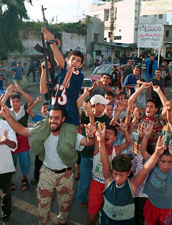 It was an outrage to see those Palistinians celebrating in the streets, throwing candy to children because thousands of innocent people had died. I've seen pictures of children holding machine guns up high and the smiles on their faces, just like the picture to the right. The ironic thing is, they're covered with America. Just look at their clothing! They apparently hate America and Western civilization so much, but they obviously they aren't spending much effort to distance themselves from us. I don't see them wearing turbans and such. They're oozing with our culture all over! It's difficult to see in the picture to the right, but the boy in the lower right hand corner is wearing an Indiana Jones T-shirt! Such hypocracy sickens me.