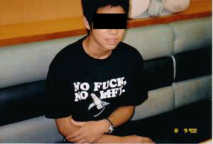 OK, here's a bit of advice for Japanese kids who wear T-shirts printed in English they can't understand: you run a very big risk of having gaijin like myself embarass you in front of your family at a highway rest area, take your picture, and post it on the Internet without you knowing. HA! Silly twerp.
