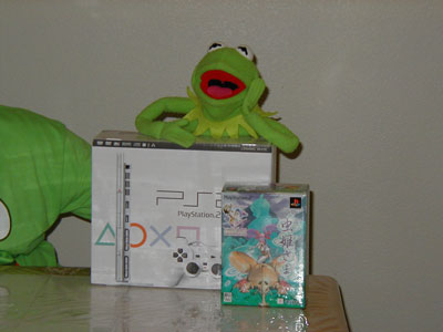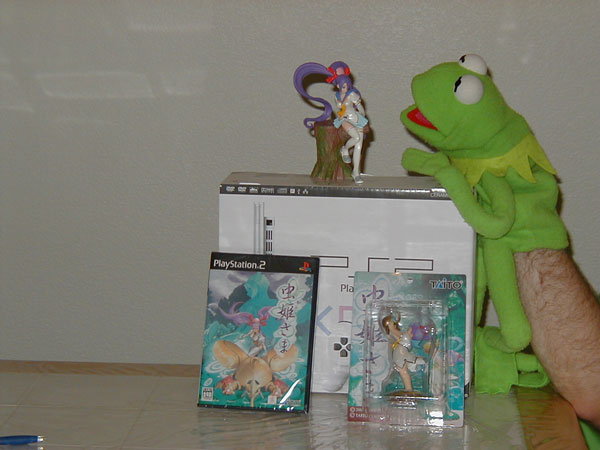 So to show off my new treasure, I enlisted the help of my friend Kermit the Frog to help model for my neat stuff and had Yuka-chan take the pictures. Pictured here is my new Ceramic White slimline PS2, the limited edition Mushihime-sama box with game and the figure of the princess Reko as a child, as well as the adult Reko figure. (And no, I'm not going to take pictures up her skirt.) You may also notice that in these pics, I'm wearing a matching Kermit shirt. Hi-Ho!