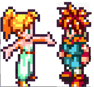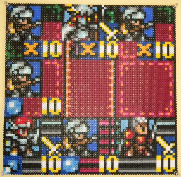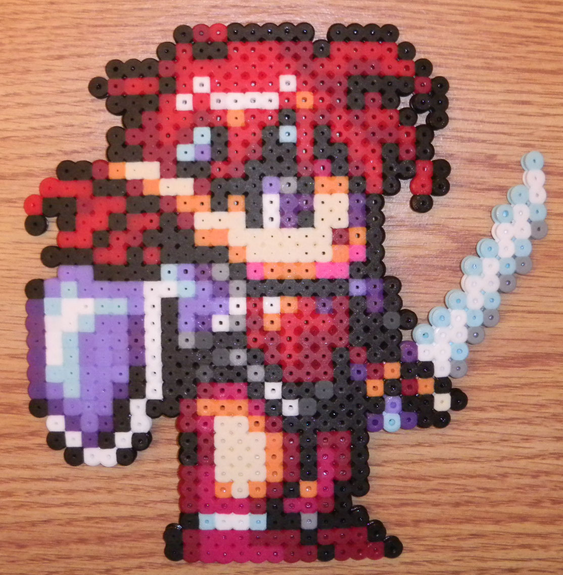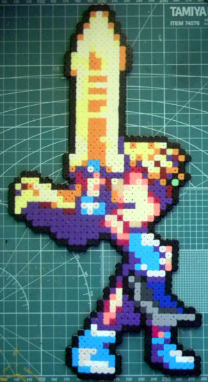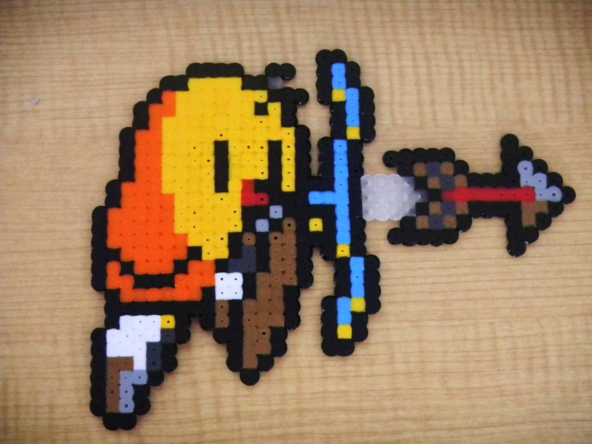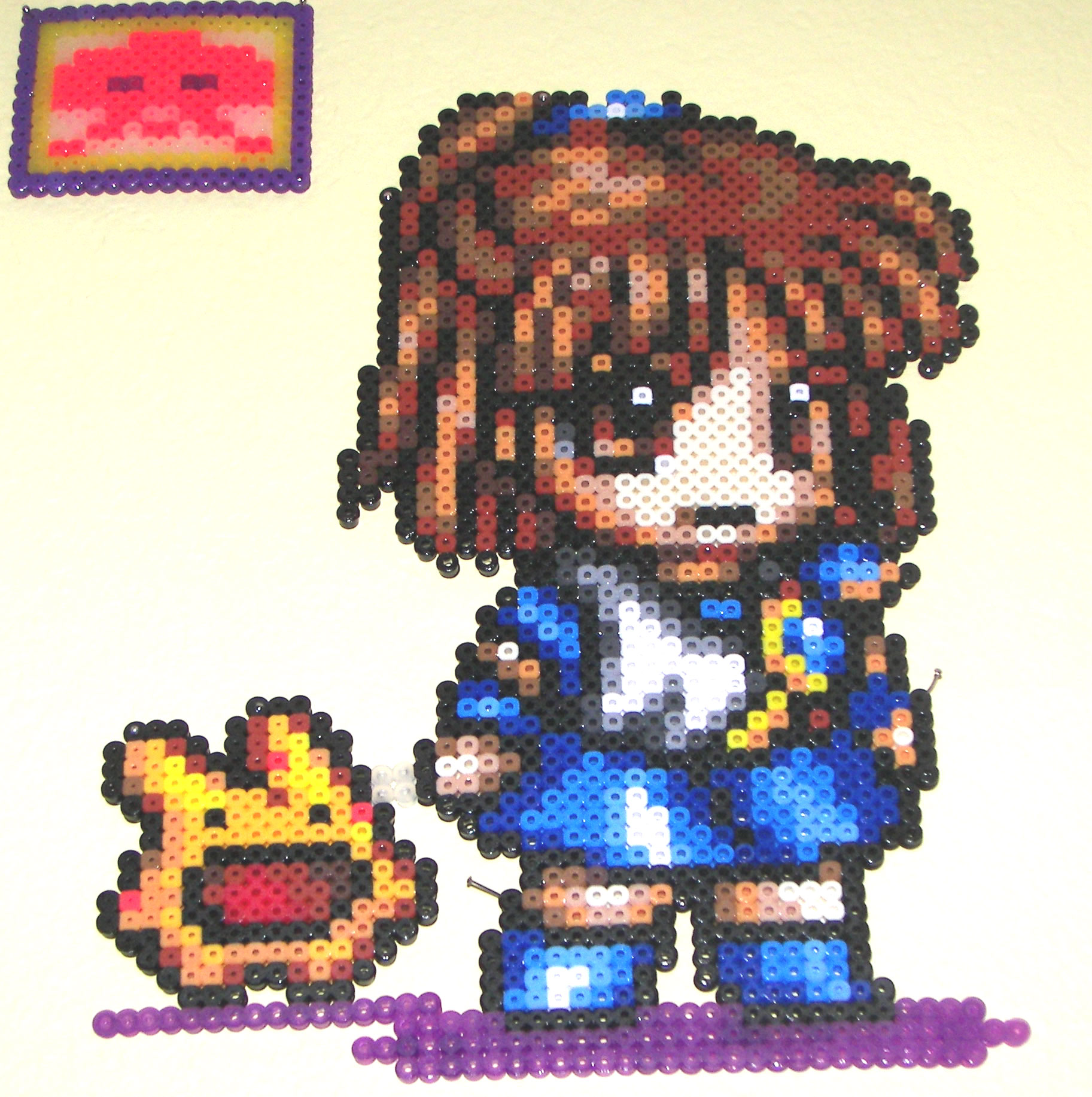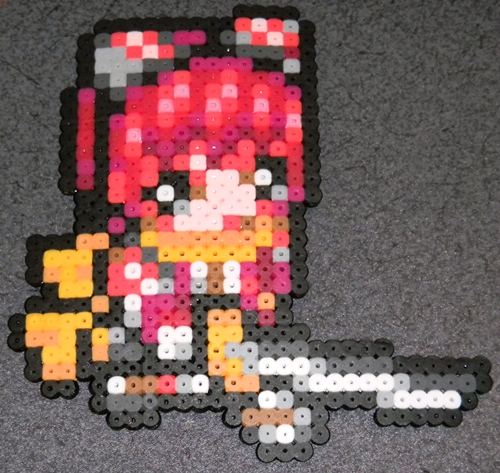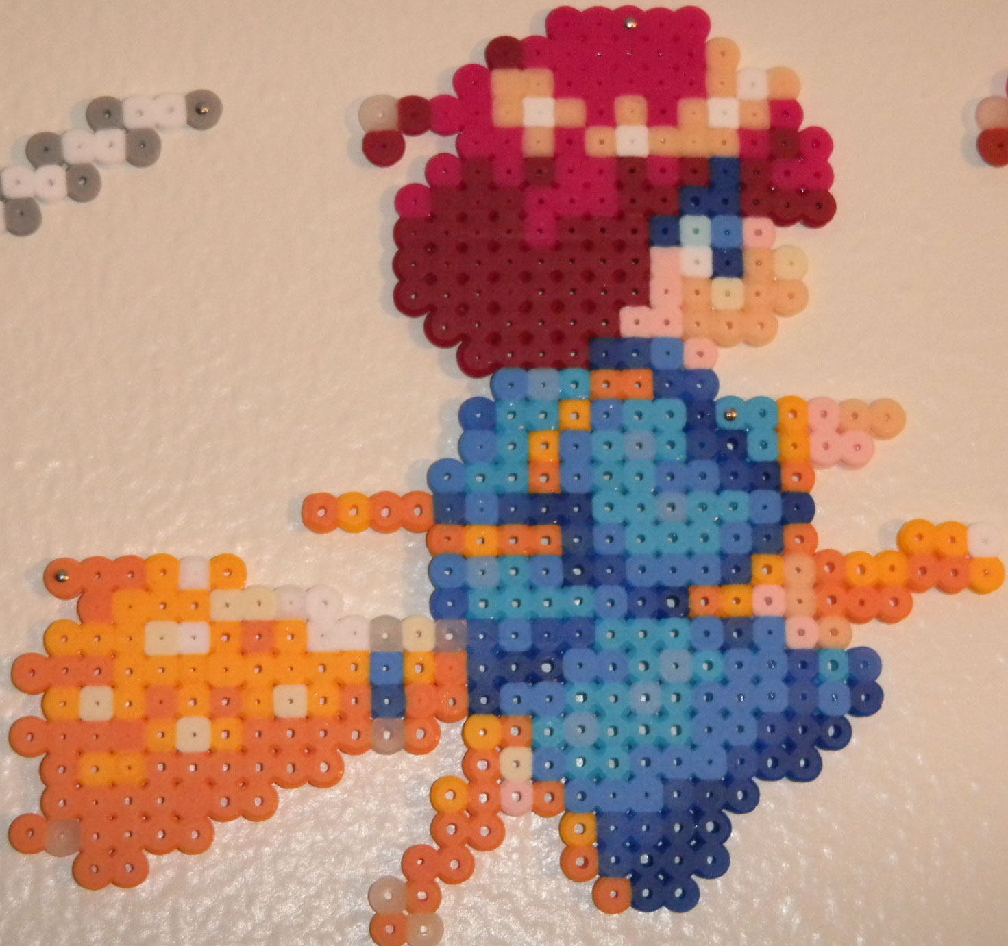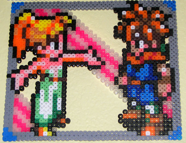 What you do is find a screenshot of a video game or a pixel dump of characters and such, load the image in MS Paint, and zoom in 800%. All you need to do then is make sure you have the proper colors, and match them bead for pixel. My first work was for my all-time favorite Super Famicom RPG, Chrono Trigger.