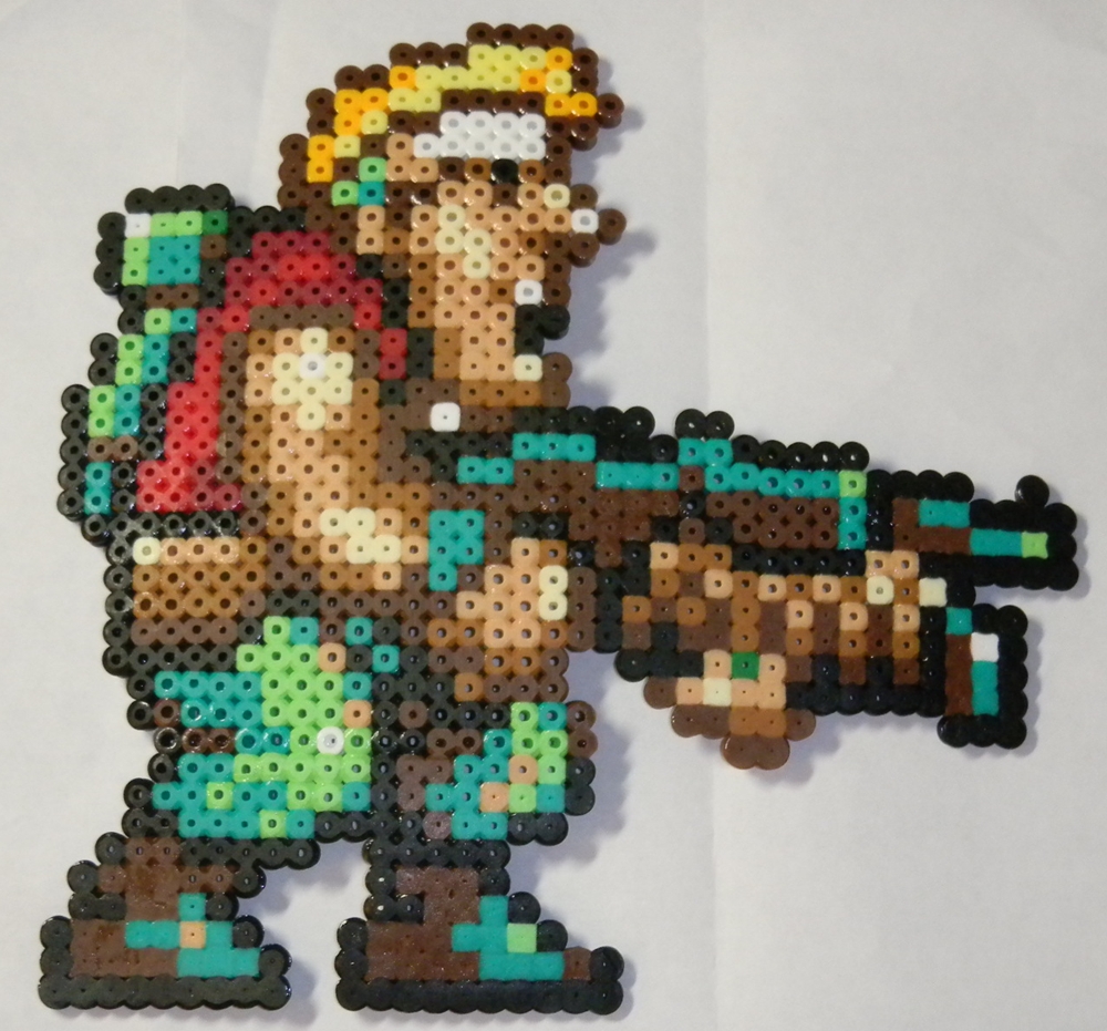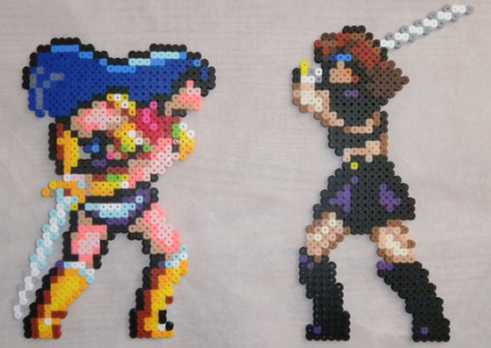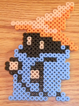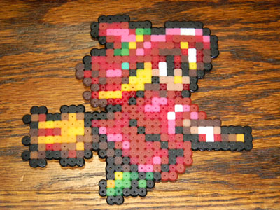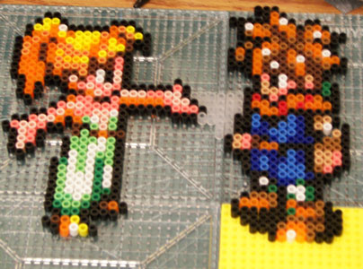 I found this website of sprite archives. And here's another NES/SNES sprites archive page. I downloaded a bunch of these tiny sprites, loaded them with MS Paint and zoomed in 800%. Bang, translate pixels to beads. Put some wax paper that the beads come with on top and iron them together. The iron will melt and fuse the beads together, and viola. Neat stuff, huh? I put a border around Marle and Crono to fit them together, and the finished Chrono Trigger product looks like this:
