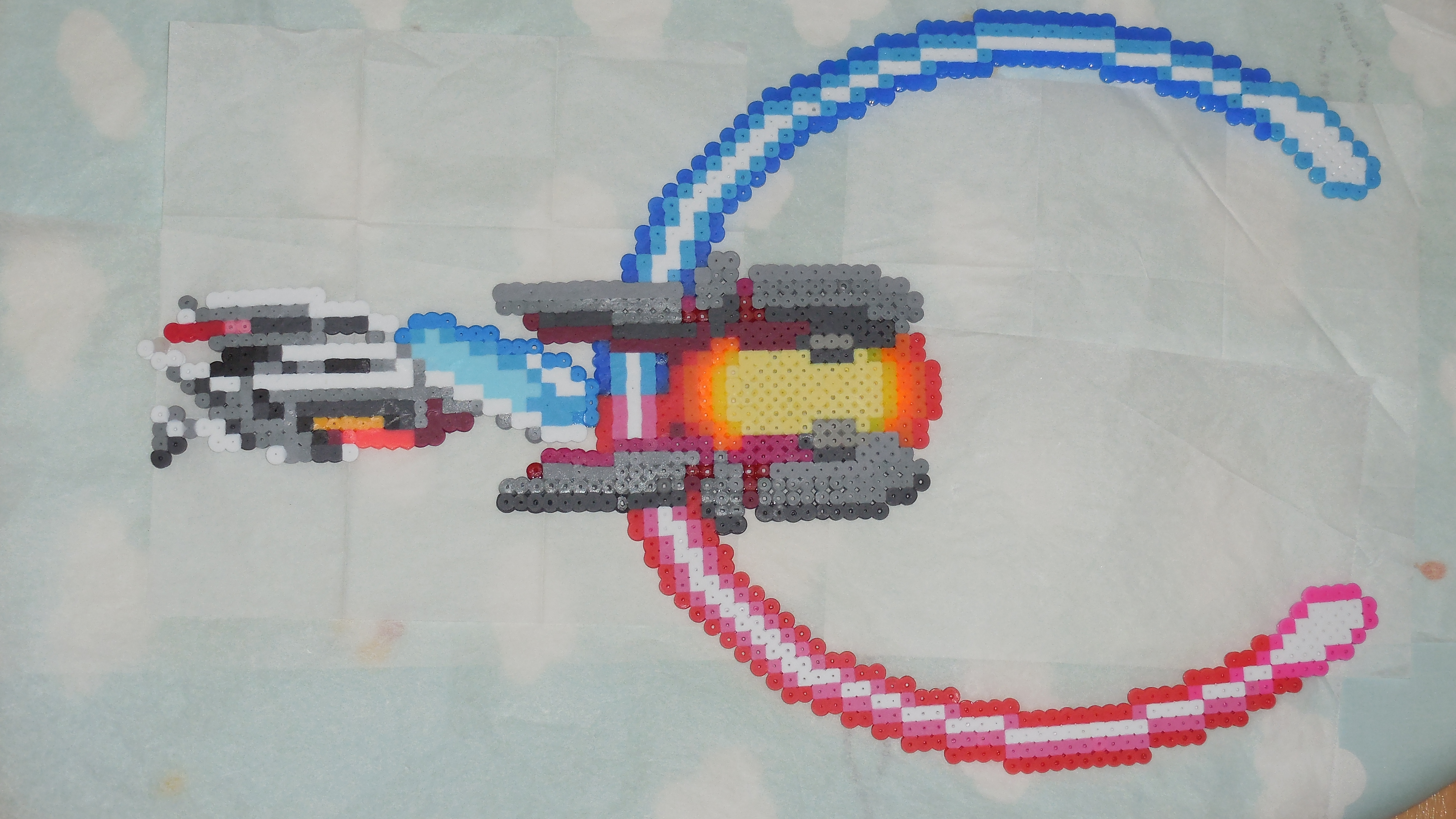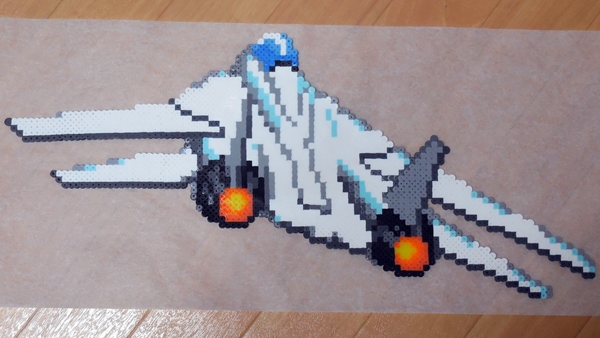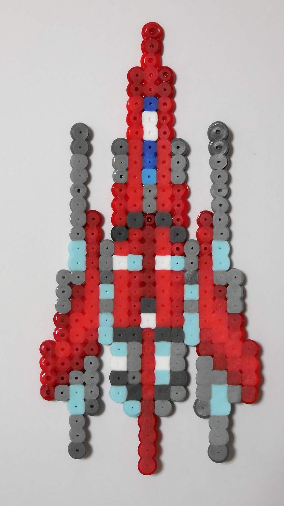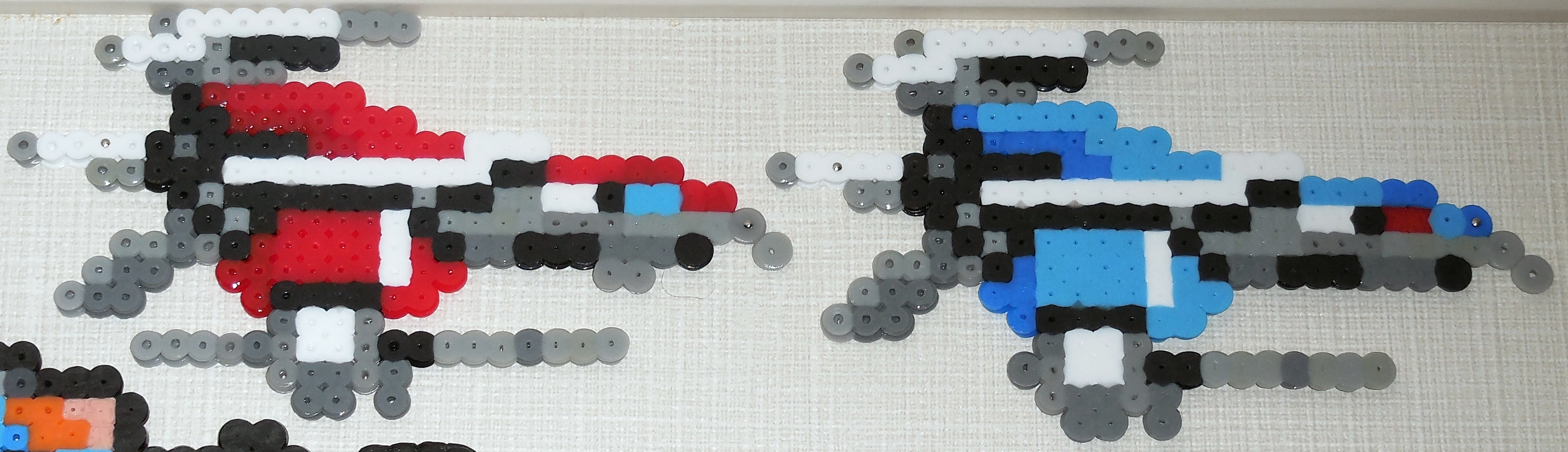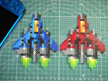 Player 1 (red) and player 2 (blue), from the Raiden arcade game. I actually missed two pixels on the red one and had to fuse them onto the completed project and the result is barely noticeable.