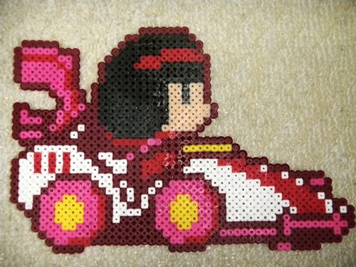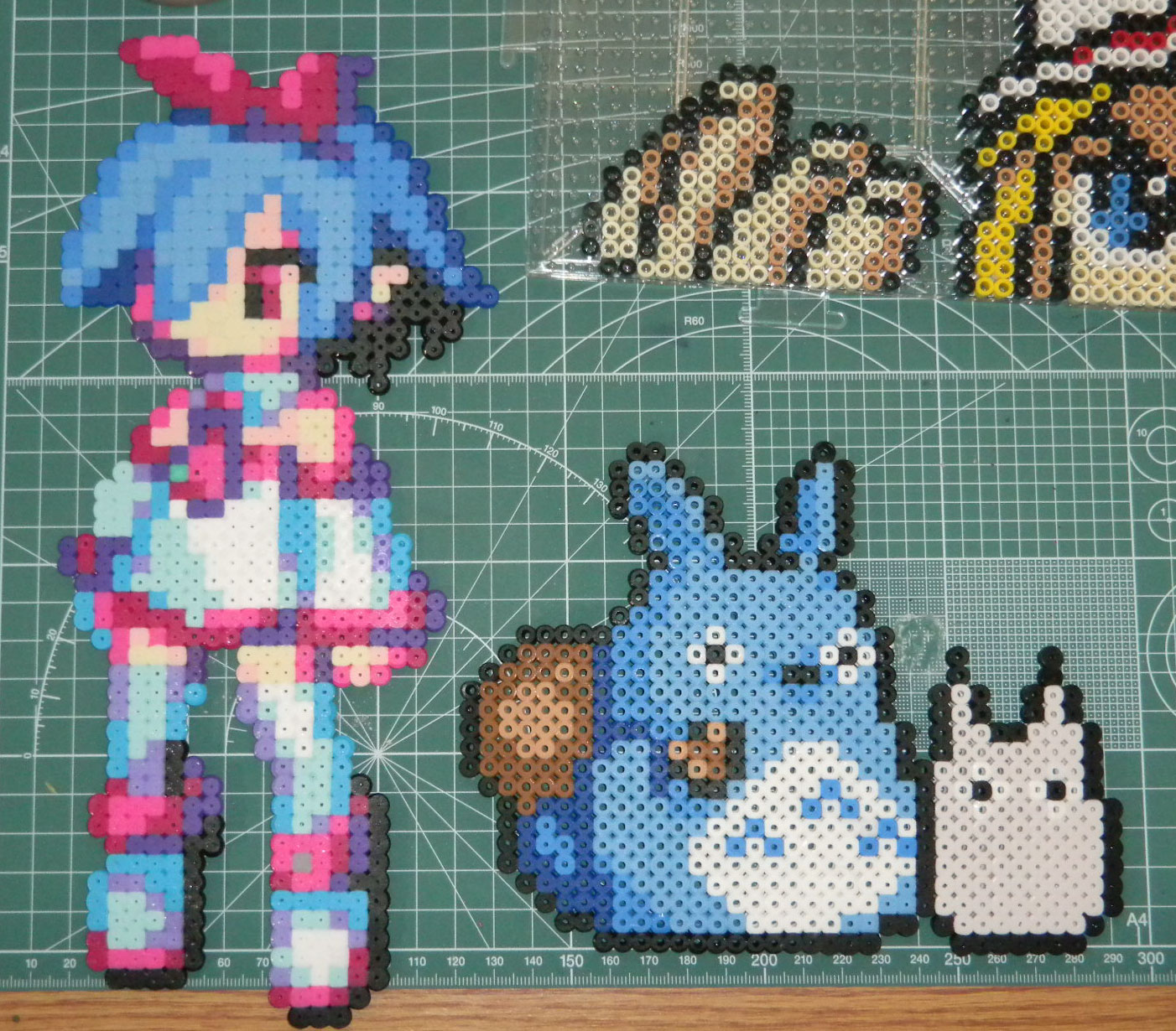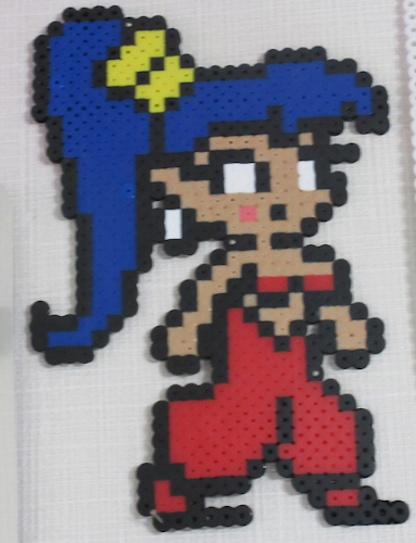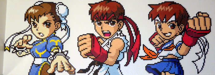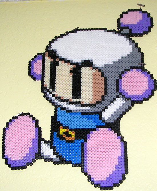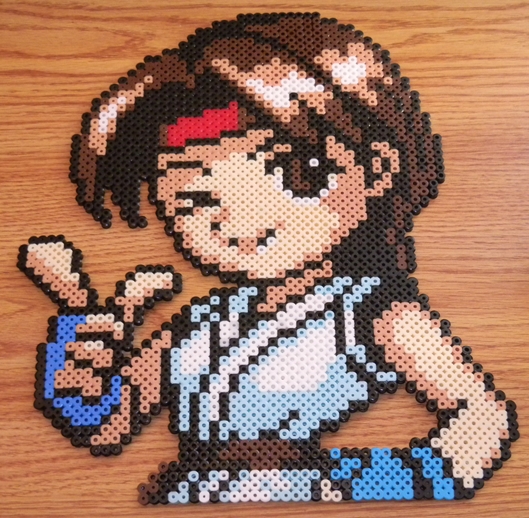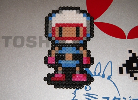 I'd seen some web sites on pixel art before after I saw Retrocalypse on Youtube showing some of his pixel art (don't remember the medium though). A few years back I bought those .S "puzzles" (a very search engine unfriendly product name, btw) of Pac Man and Dig Dug in Harajuku's Kiddie Land. Some people have done this with Lego bricks, but I was looking for an easier medium to make pixel artworks with to celebrate my love for the Super Famicom and sprite-based games in general. Well, when I was at JoAnn's with my wife, I saw these boxes and bags of Perler beads. I figured that this would be the perfect medium for making these. It turns out that there's an entire fanbase on the Net for this sort of thing, and I discovered the Pixelgasm Forum, a nexus for others pursuing this hobby. Doing a search on the Net, I've found plenty of people displaying their artworks. Check out this girl's photos of her works. Her works are awesome.