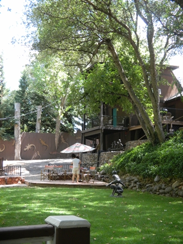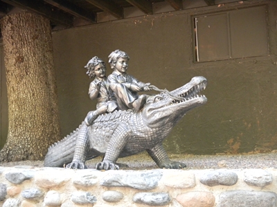 On the top level where the front office is, there is an outside television (interestingly enough), a gas grill, and a koi pond. One unique aspect of the hotel are the interesting sculptures that are found throughout the property, such as the leapfrogging children in the park, or the children riding an alligator.