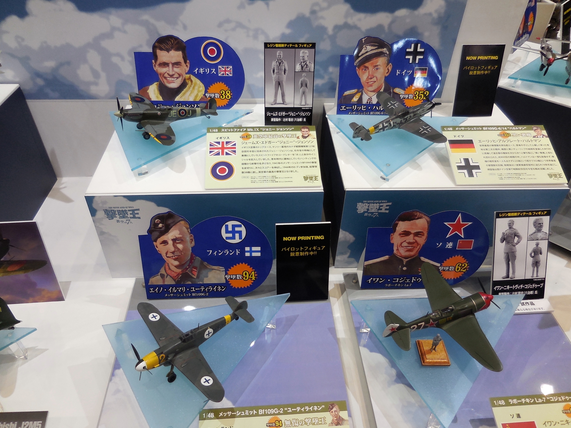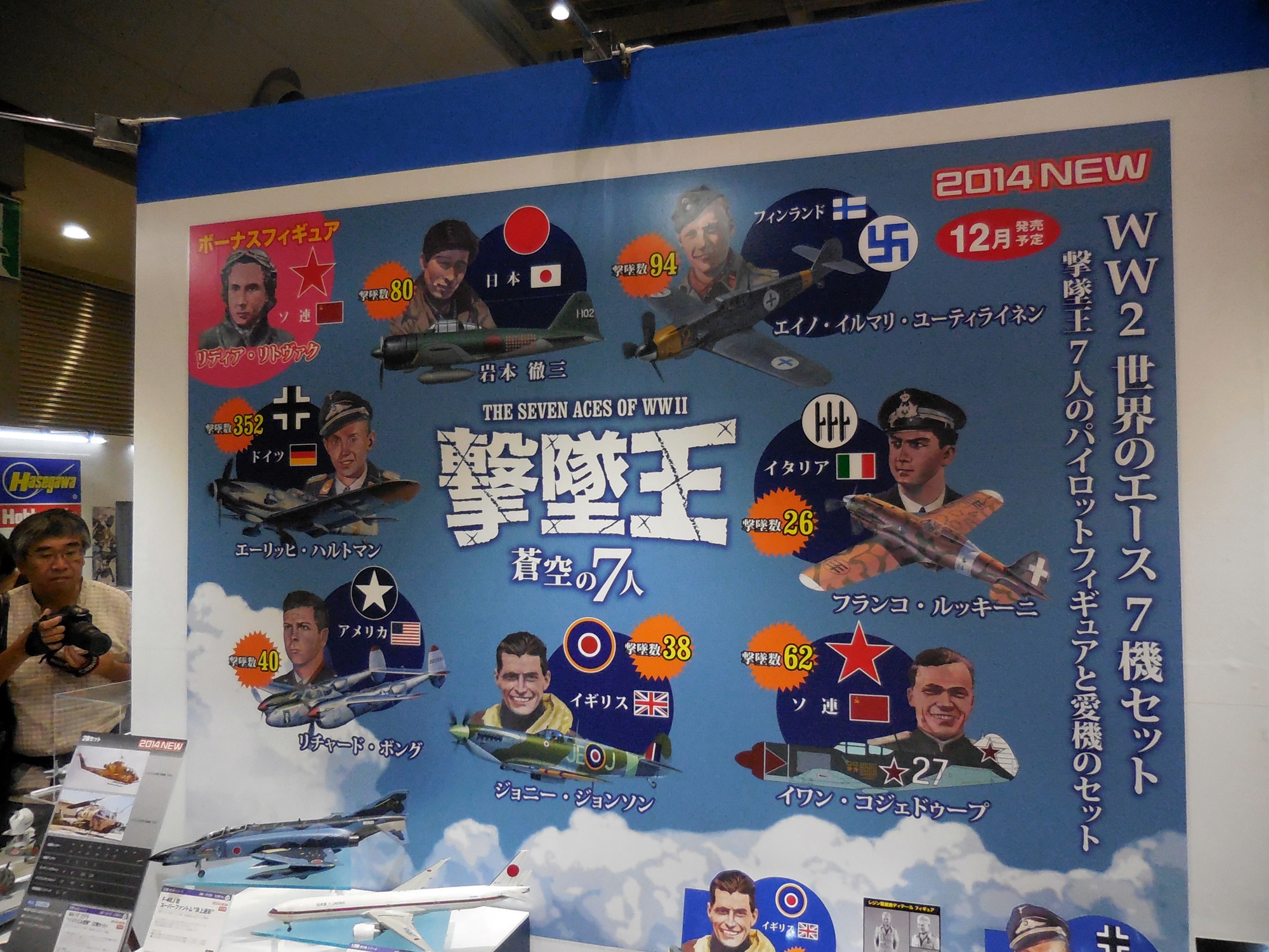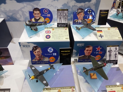 Left: Continuing with the Seven Aces display, we have the American Richard Bong and his P-38J Lightning, Japan's Tetsuzo Iwamoto and his Mitsubishi A6M2b, and finally Franco Lucchini of Italy and his Macchi C.202.