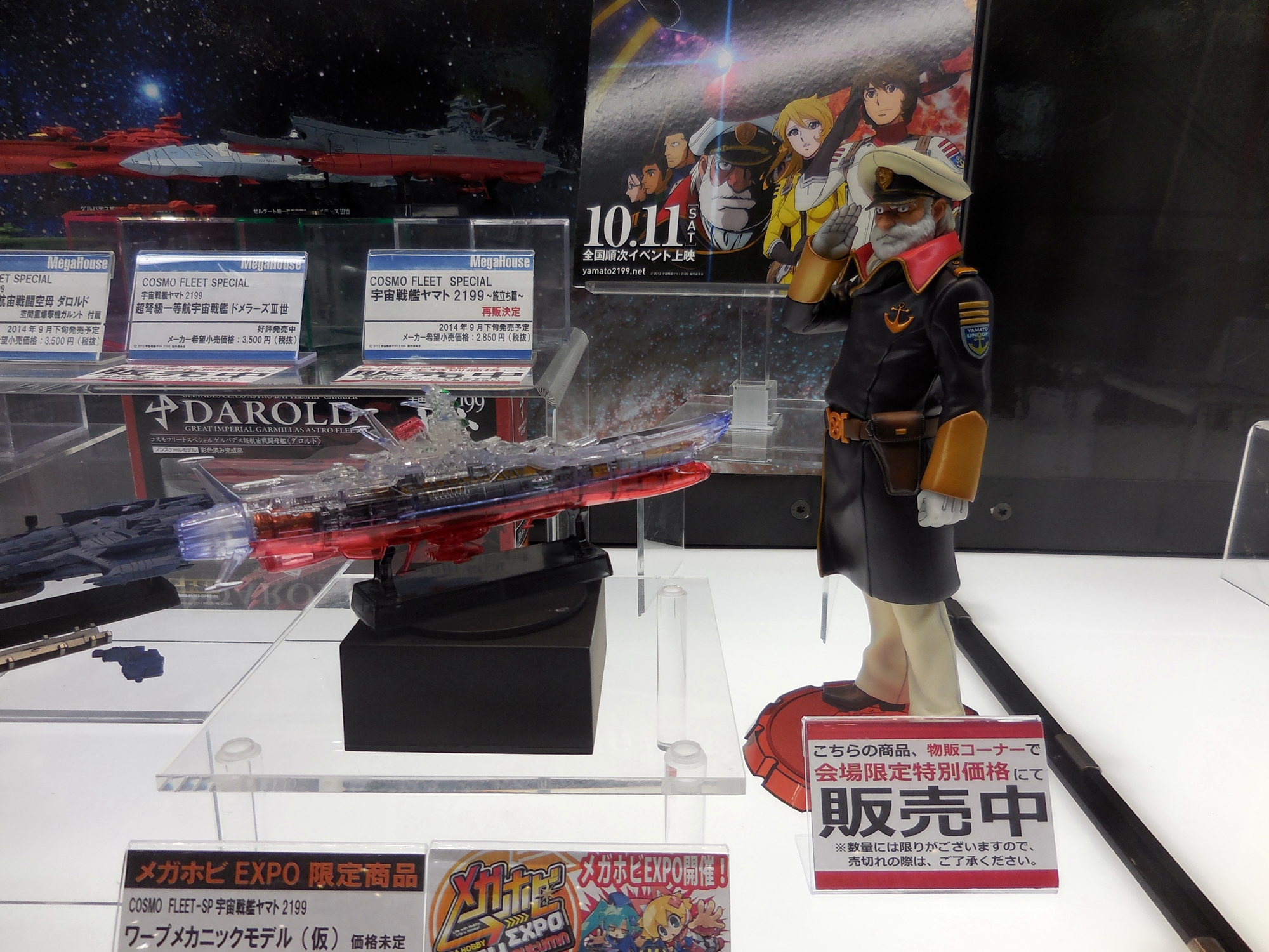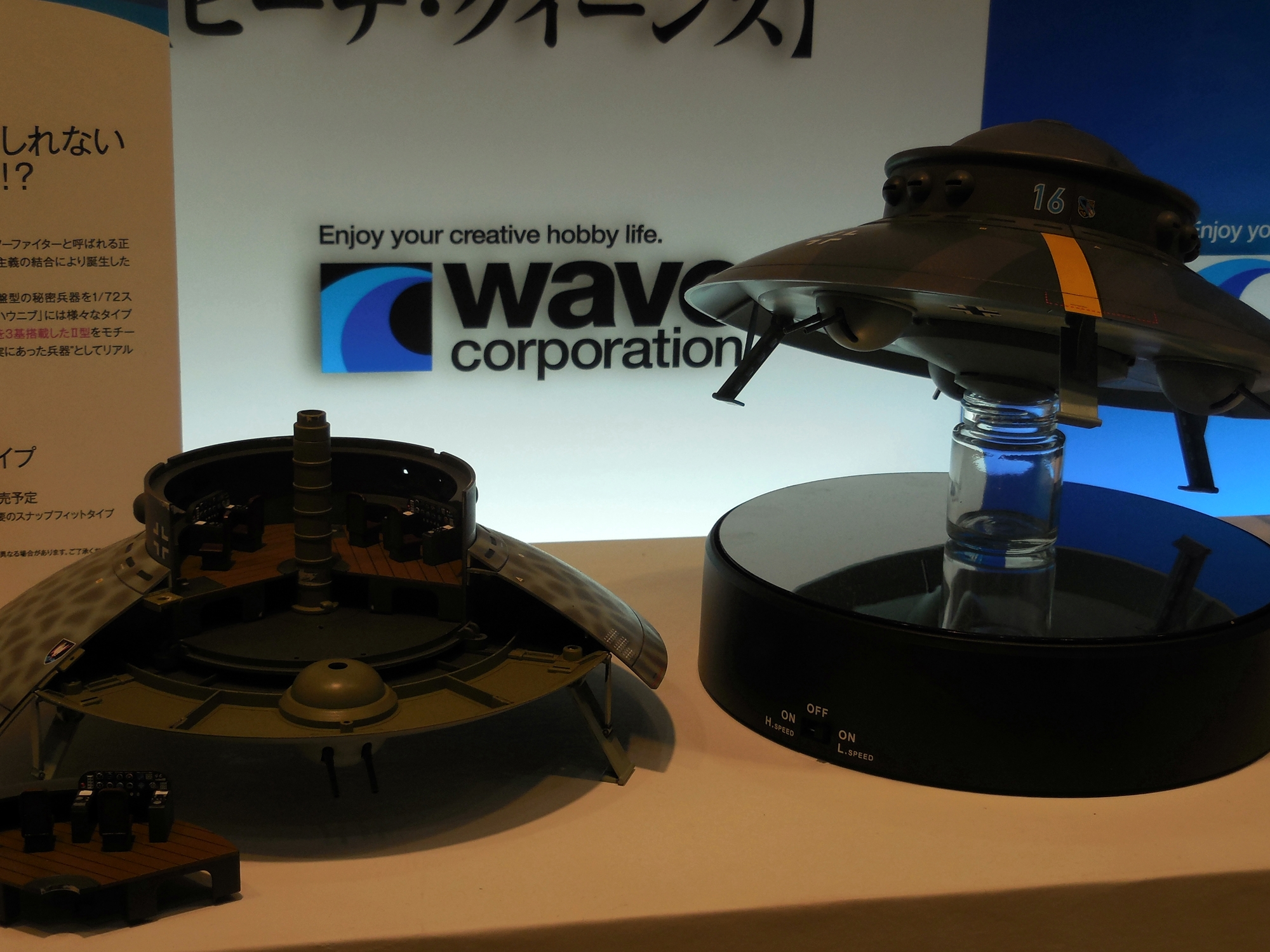 Left: This legendary Nazi flying saucer marks the end of my pictures at the Wave booth. Right: Here is Megahouse's display. They don't make plastic models for assembly, but instead they make pre-assembled models and figures. Here is a Captain Okita figure. I'll be cosplaying as Captain Okita for Halloween this year, if all goes as planned.
