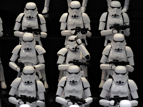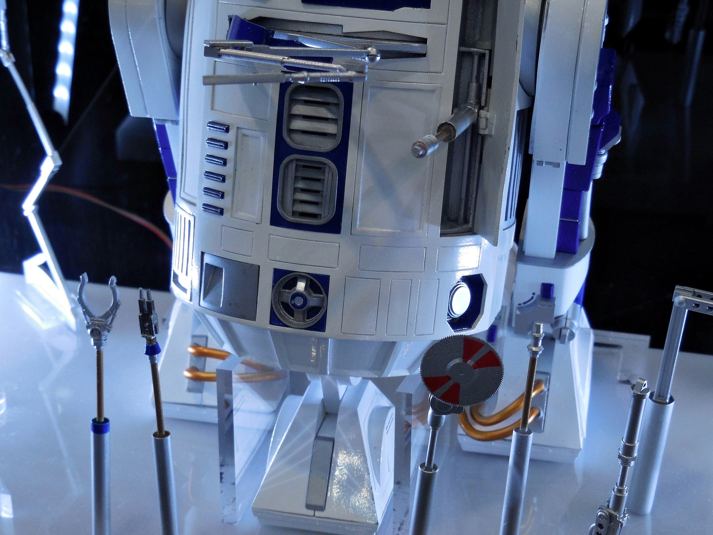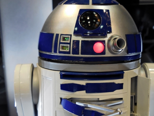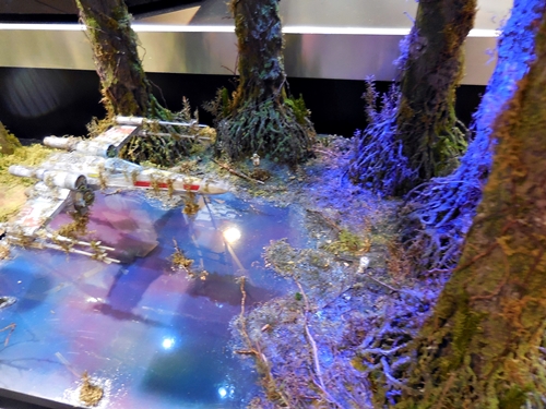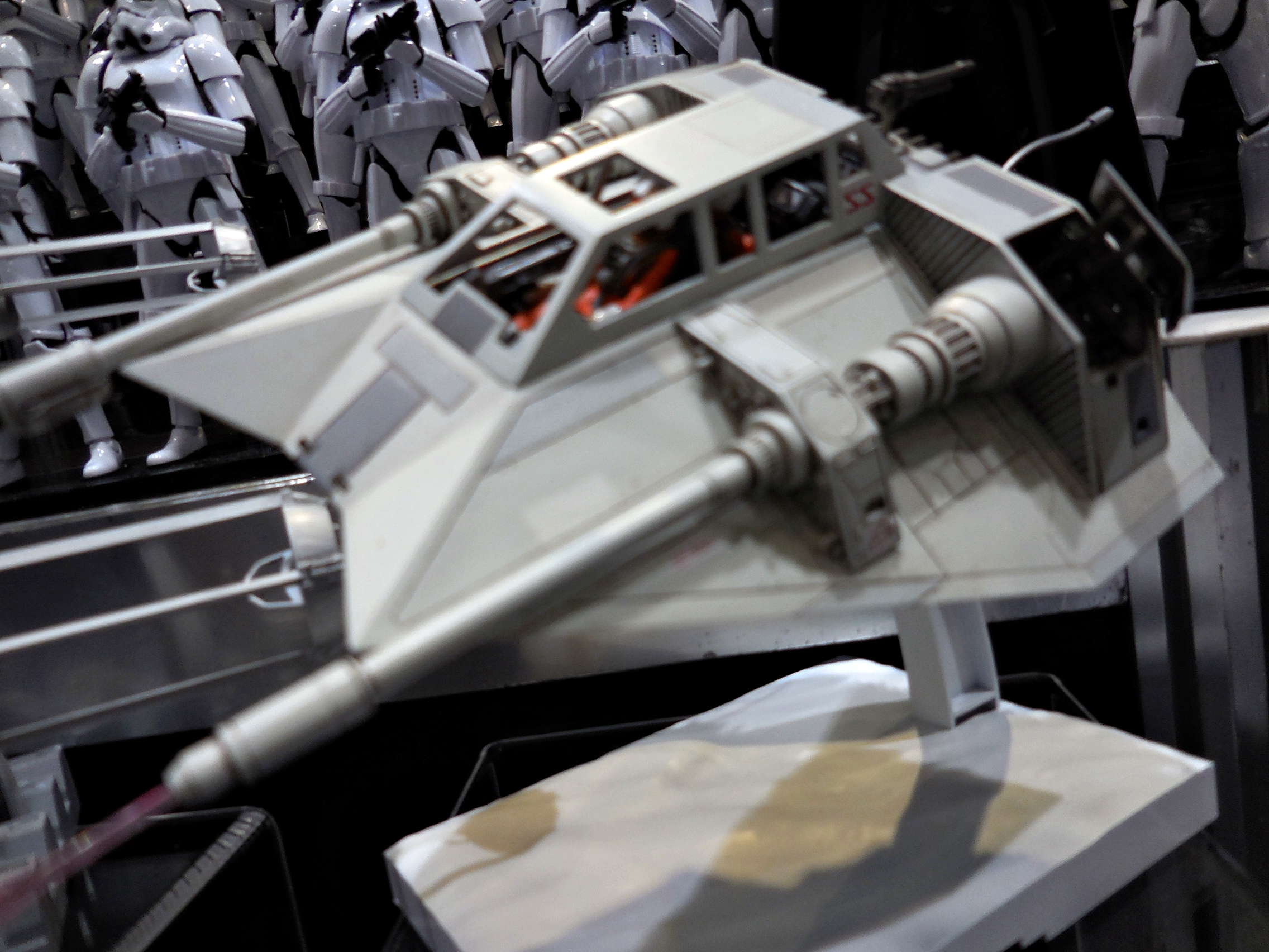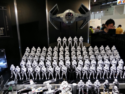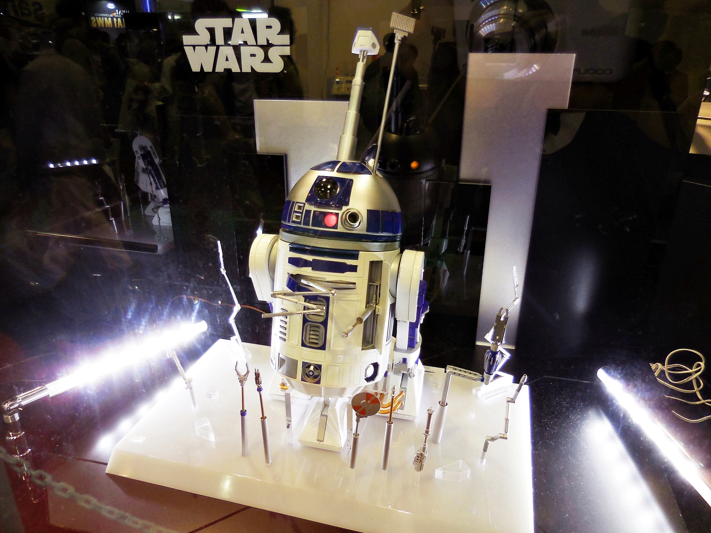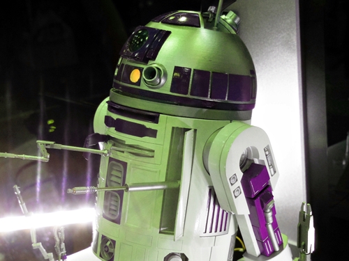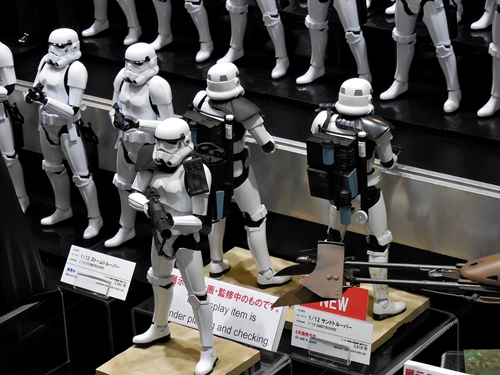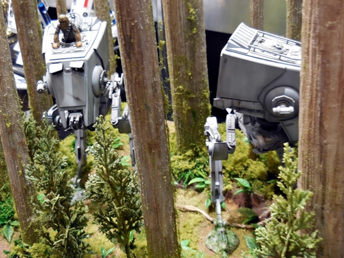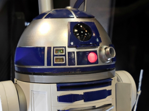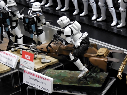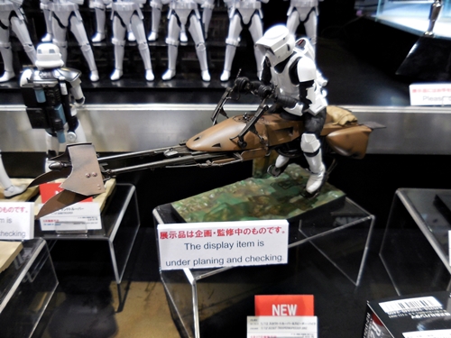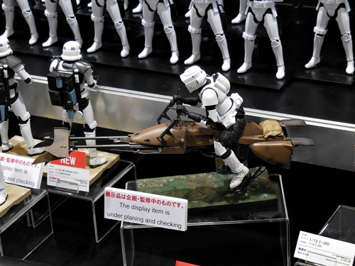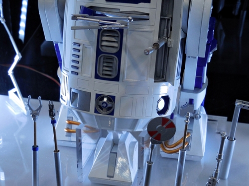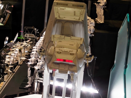 First up is the Bandai showcase, with an upcoming 1:4 scale R2-D2. It appears to be pre-made for lighting. To the right is the motorized AT-AT that Bandai has not yet decided to release. I'd rather not have a motorized one. If you look inside the viewport, you don't see an accurate cockpit, but just a bunch of moving parts. Accuracy is often sacrificed for the sake of motorizing parts.