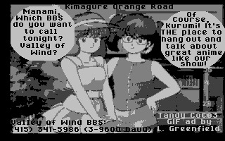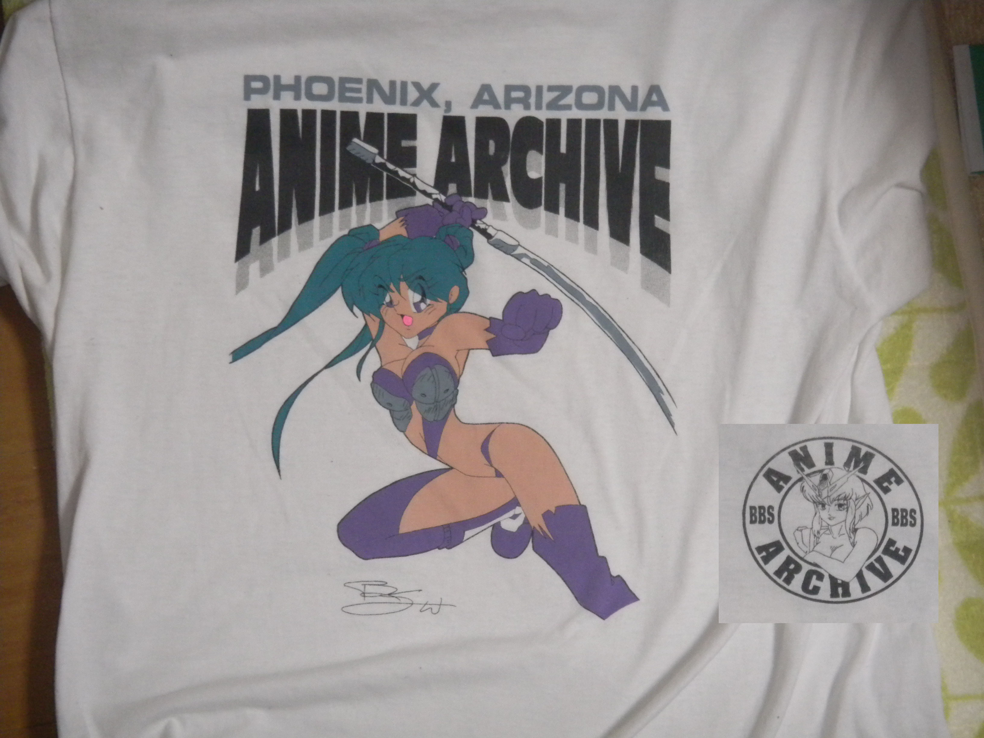 Here's my shirt of the Anime Archive BBS from Phoenix, Arizona. This was a time before I knew much about the internet at all. In fact, later when I was in college, the SysOp of the Anime Archive once showed me this thing called the "world wide web" and it was a fan's website dedicated to Kimagure Orange Road. Far out! It even had pictures. It blew me away.Anyhow, this is the back of the shirt; the smaller inlet image is from the front left breast area. Two local Arizona artists were commissioned to make this shirt.