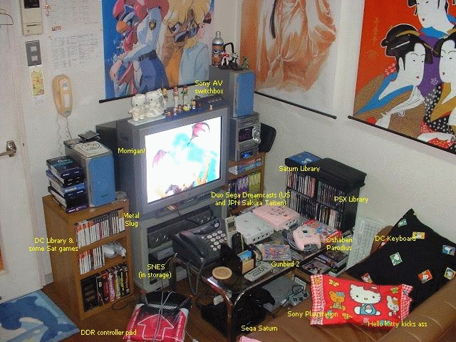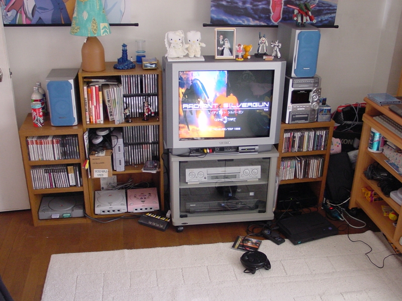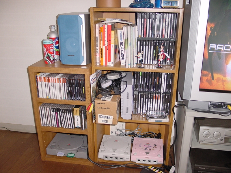 This was my gaming/entertainment setup for my fist apartment. This was my first full-time job after graduating college, and I had such a tiny game collection then! My Saturn and Playstation were under the table, and on the table was my US and JP Dreamcasts. (My SNES was packed up at the time.) BTW, that big Toshiba TV with a flat screen had ridiculously high S-Video filtering. At the time, people confused it for an HDTV. I ended up giving it to my friend in 2012 when we moved back to Japan, and he still has it. It's gotta be super expensive now, the way CRTs go these days for retrogaming!