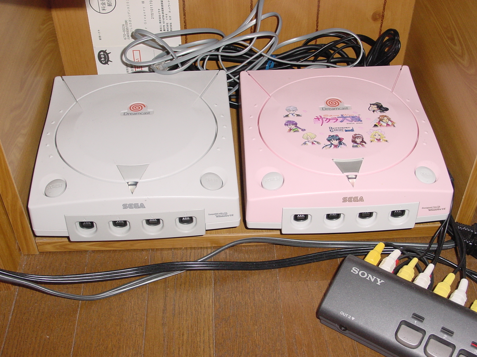 A close-up of my US and Japanese Dreamcasts. When I first came to Japan, I was using a boot disc to play Japanese games. The drive would grind back and forth for a while until the drive was ready to replace the boot disc with the game. So in December 2000 I bought a Japanese DC, and I wanted to make sure it would stand out from my American one. So I got a pink, Sakura Taisen LE DC.