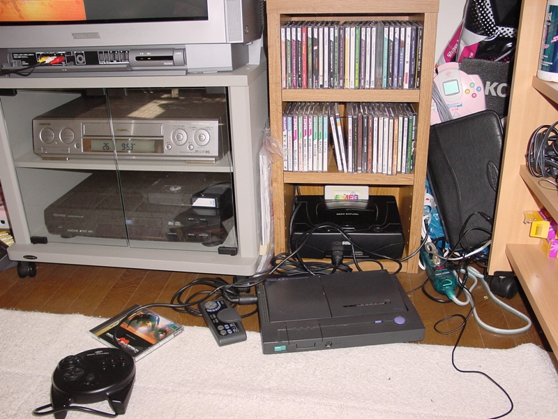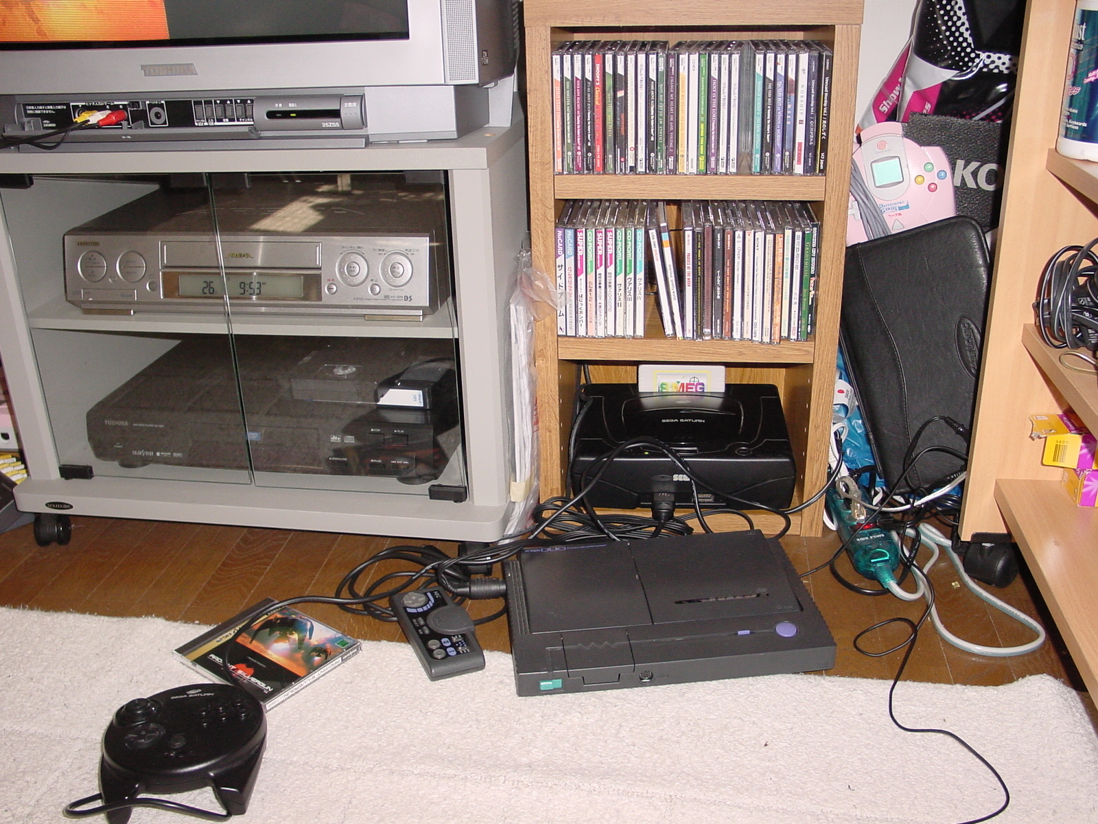 Here is to the right and underneath of the TV. That's a black US Saturn you see here. I had just bought the Turbo Duo in Osaka's Den Den Town along with several games. They were cheap because the PC Engine wasn't popular at that time as the system had been retired several years prior. On that same shopping trip, one store had a literal pile of brand new, white Saturns for sale. The display was rather tall. I was so tempted to get one, but since I had just bought the Duo and didn't want to spend much more, I decided not to buy one. It's a shame, because I could have just used my credit card. Still, my arms were already full with shopping bags and we would have to ride a cramped shin-kaisoku express train back to Himeji that evening.