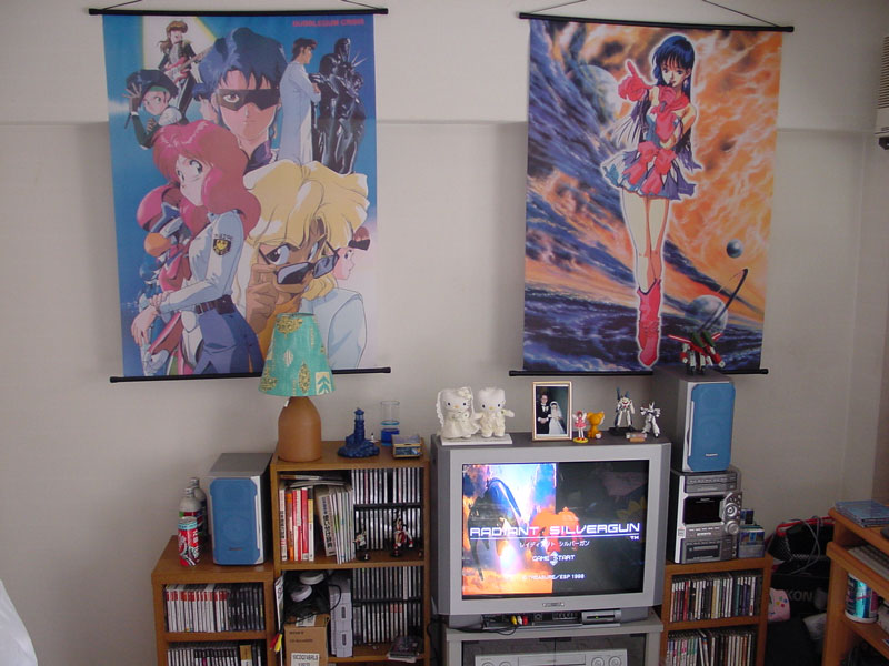 This was my gaming/entertainment setup for my 2nd apartment in Japan, in 2001-2002. After we were married in March, from April until July 2001, Mayu and I lived a cramped life in the first 1K apartment. Then in August we moved from the 2nd floor to the 3rd floor of the building after one single woman who had a larger apartment moved back to America. In this picture, you can see how my game collection had expanded, with TWO Dreamcasts (A US DC and a LE Sakura Taisen DC) and the addition of a Turbo Duo. Heck yeah. In the corner is my computer desk.