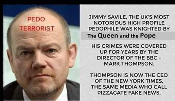 Yes, the BBC knew about Saville. This is Mark Thompson, the man who covered for Saville's disgusting perversions. He now runs the New York Times. Oh, but take the word of the NYT on Pizzagate. Yeah, it really was about Hillary torturing kids in the basement of a pizzeria, not about her campaign manager John Podesta's emails published by Wikileaks rife with pedo code speak, Spirit Cooking, and other disgusting crap. Oh, and whatever you do, do not do a non-Google search for "Podesta art" and do not look at the images posted by "JimmyComet" on Instagram. Sick stuff.