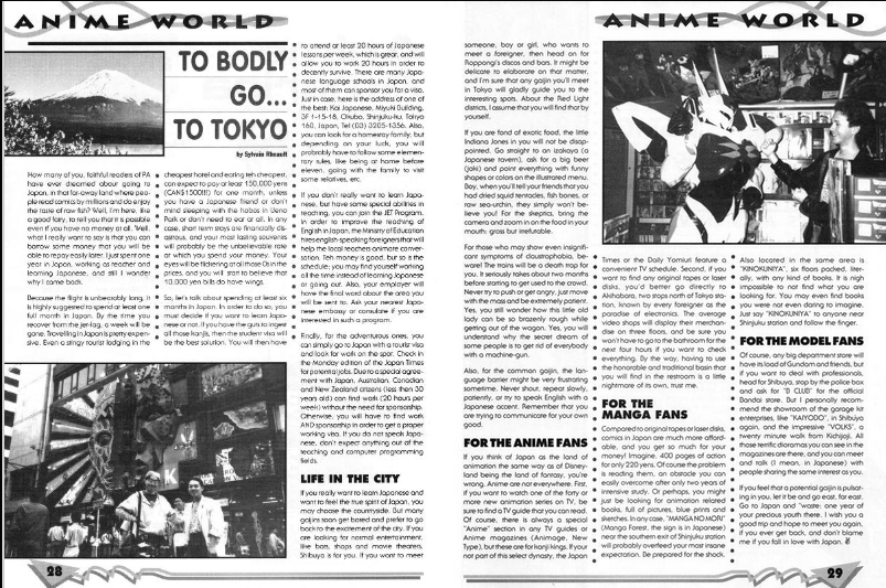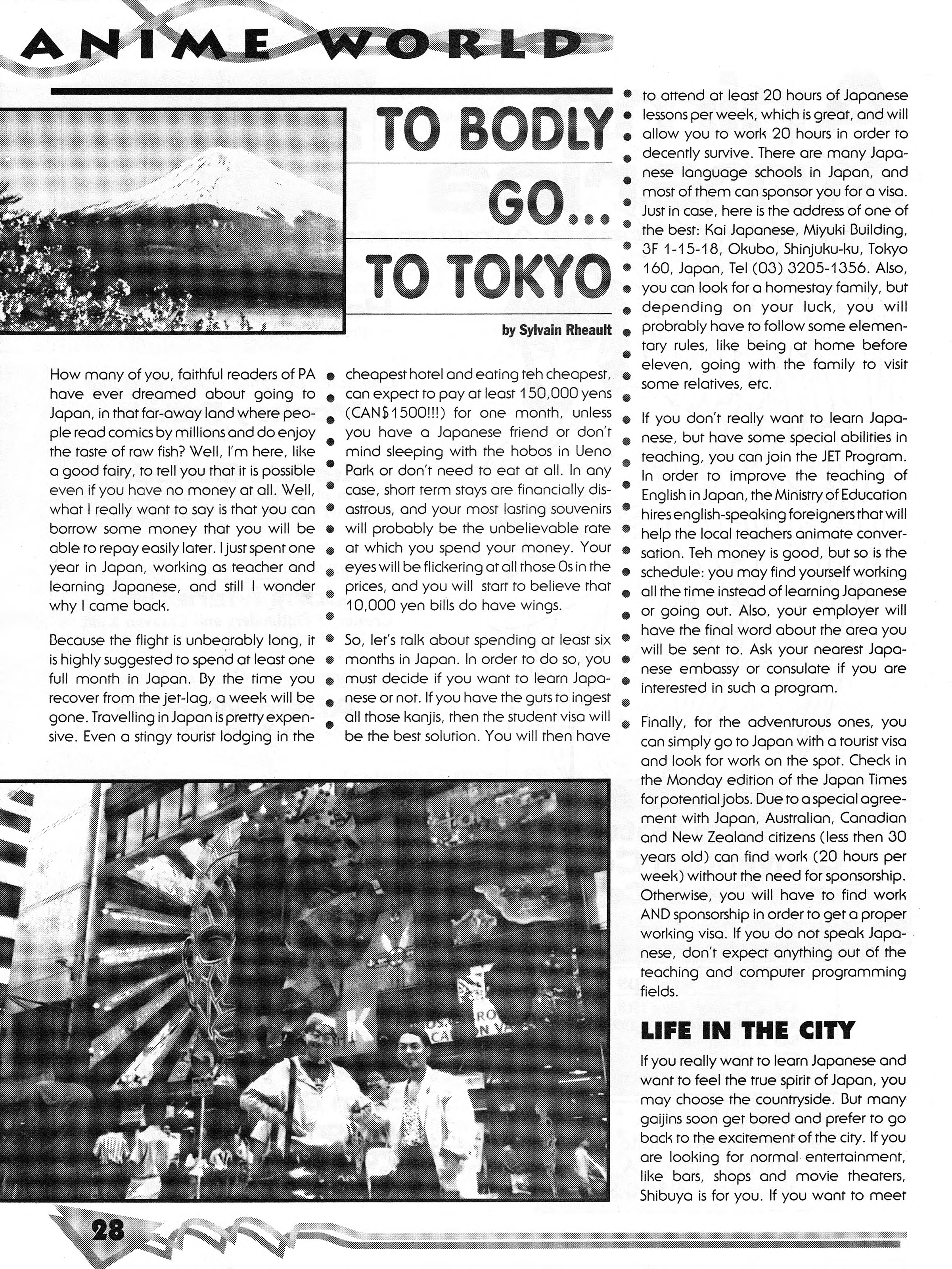 This is it! Thanks to the sparkly magic powers of THE INTERNET, I have found a scan of Protoculture Addicts issue 22! This is the magazine I bought in high school which had the article "To Boldy Go... To Tokyo" written by Silvain Rheault, someone who had just returned from spending a year teaching English in Japan. THIS ARTICLE is what gave me the inspiration to someday get a job in Japan once I graduated college with a degree. I gave my stack of Protoculture Addicts, Animerica, and Animag magazines to someone just before I moved back to Japan 11 years ago, but thanks to Archive.org, I have found the article that changed my life. (I still have my sole issue of Mangajin magazine from which I found the ad for ALC's pen pal service with which I met the girl I eventually married!) The article is on pages 28 and 29. The entire magazine's scan can be found here.