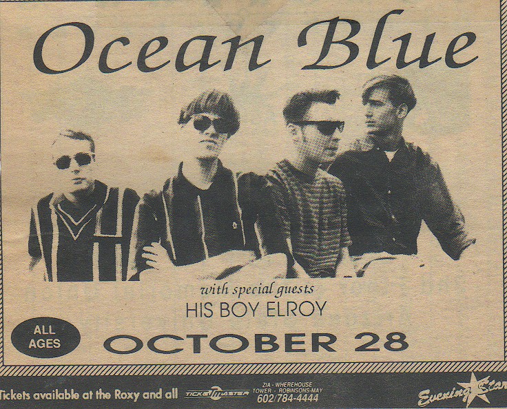 Thursday, October 28th, 1993 was The Ocean Blue in concert at The Roxy in Phoenix for their third album, "Beneath the Rhythm and Sound." Their single "Sublime" had broken into the Top 40 chart. I was a senior in high school. Barry took me to that concert. He had wanted to go to a Gin Blossoms concert that night, but I reminded him of his promise to take me to see The Ocean Blue in concert. I think his wife was listening to our phone conversation and she told him to keep his promise. Fortunately, it was an all-ages concert as the Roxy had a sectioned-off place just for alcohol. So we were in line outside before the concert began, just sitting down. There was some long cigarette butt on the ground next to where I sat and Barry pointed to it and exclaimed, "Nice butt!" I remember there were two annoying high school girls wearing Suede T-shirts who kept talking to us. Neither of us really cared for Suede, but these girls kept trying to convince us to buy Suede's album. Yeah, whatever.
