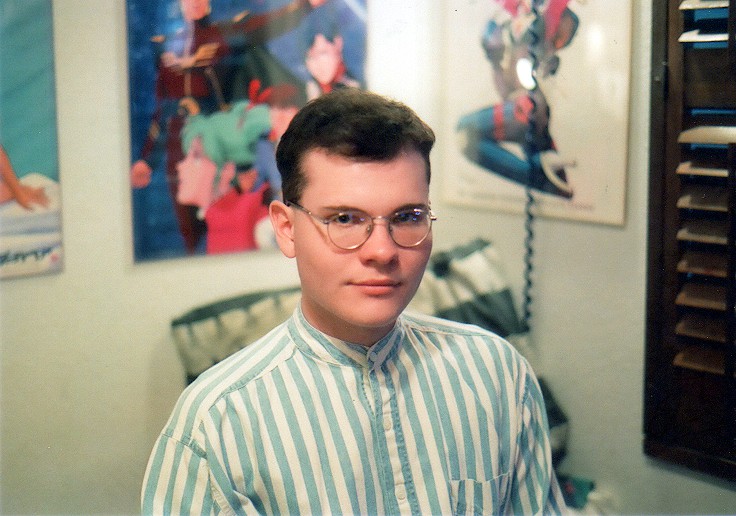 To the right I'm sitting on my bed. You can see my Dirty Pair, Gundam: Char's Counterattack, and Bubblegum Crisis posters behind me.