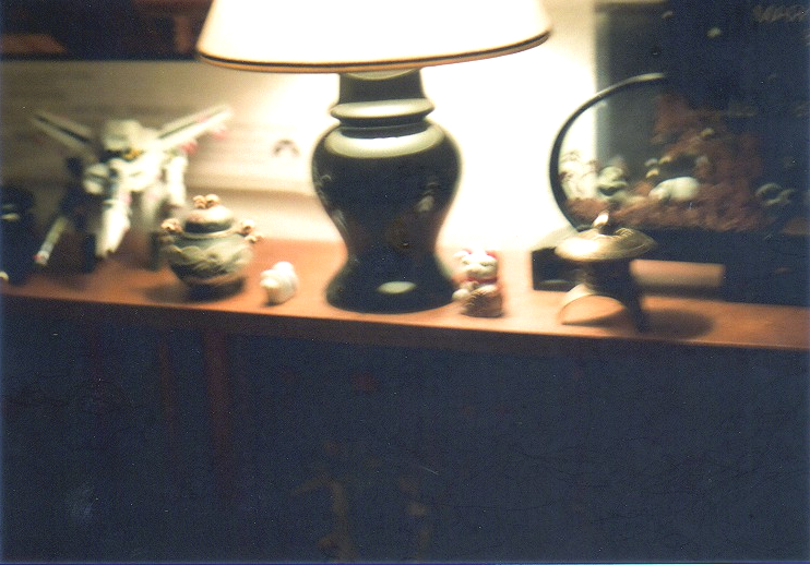 Alright, so this photo was taken by mistake, but it is still kind of cool, so I will include it here. This is the lamp atop my book shelf, which was on my counter. You cannot see the Robotech, Star Wars, and other SF novels on the shelf, but you can maybe barely see my V Gundam and Gundam F-91 action figures I'd bought at the Starlog store at Arrowhead Mall. What you can see is the Bandai/Imai 1:72 scale Macross Valkyrie plastic model my friend Ry helped me build, two Chinese incense burners, and a Chinese cork carving featuring a panda inside. I bought that cork carving at the Chinese New Year in '96 and had bought a similar one for Juliet, a girl I was in love with that year who broke my heart. You can't tell, but the posters on the wall are of Raiders of the Lost Ark and The Empire Strikes Back.