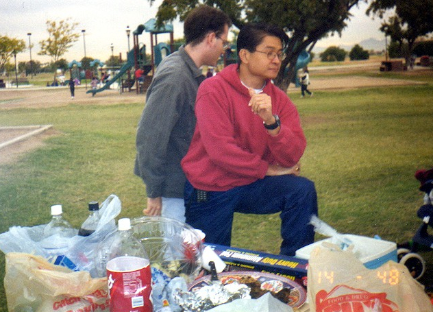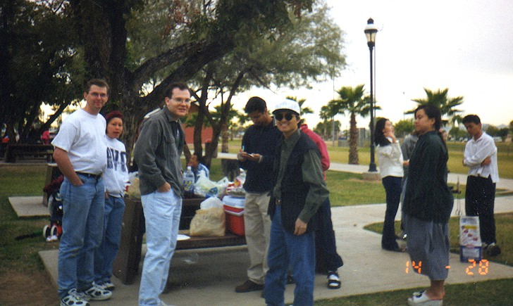 Erica, my friend who worked at the library with me, invited me to join the Asian Pacific Islanders Association chapter she had begun at ASU West, since I was interested in not only Japan but Asia in general. Plus I was already making friends with several Asians on campus. This was the Spring '98 semester, I believe. Before I knew it, I was named treasurer of the club, and I really wasn't even interested in having such a title in the club. I was just there to socialize, you know? We had our own little club room on campus for meetings and such. We did fun stuff together, attending different functions with other APIA clubs (which were much bigger than our small club from our small campus), we attended events put on by the Asian clubs at the Thunderbird school, we went to see an Asian comedy group perform somewhere, we'd go out to dinner together, and once we went to Gameworks at the AZ Mills mall. Once since I was an employee at the school, I was able to request an ASU West van to borrow for one evening. It was Erica's idea to go to the Indian casino and enjoy all-you-can-eat crab legs at the buffet there, so I drove the APIA club to dinner and we had plenty of crab legs, and I suggested we request a table in the smoking section so that we wouldn't have to deal with the long wait even though none of us smoked. Yeah, we had some fun times. We had a faculty advisor named Kee, a Chinese guy from Malaysia, and he and I became friends. He even wrote a letter of recommendation for me to use for applications to the JET Program and the Phoenix Sister Cities teaching program. (Kee and I remained friends even after I moved back to Arizona from Japan in 2002). We once had a BBQ picnic at a park for Veterans' Day November 11th, 1998.