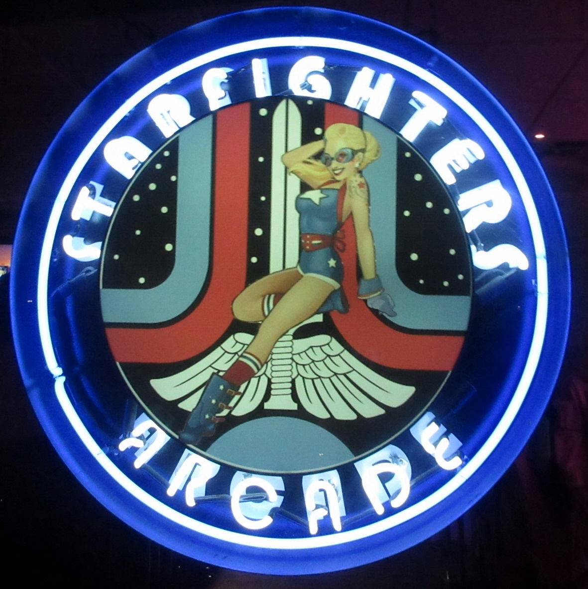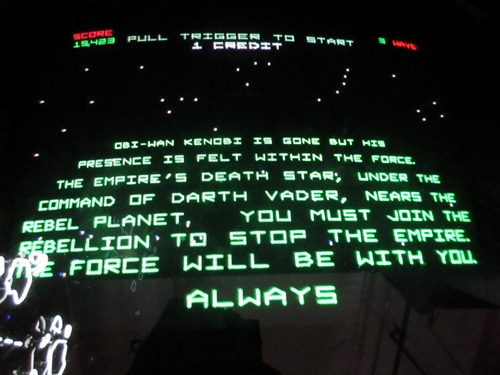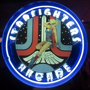 The location is not what I expected, as it is in a business park rather than a strip mall. We arrived around sunset. From 7pm to 11pm on weekends, one can pay an entrance fee of $15 and enjoy all-you-can play arcade and pinball games while absorbing the wonderful retro ambience. Aside from all of the great games, Starfighters features awesome movie posters, toys from our childhood, great '80s music, and other nostalgia. When I first walked in, a Psychedelic Furs song was playing. Some non-functioning sit-down cabs were lined up by the entrance, which was unfortunate because Atari's Red Baron was one of them.
