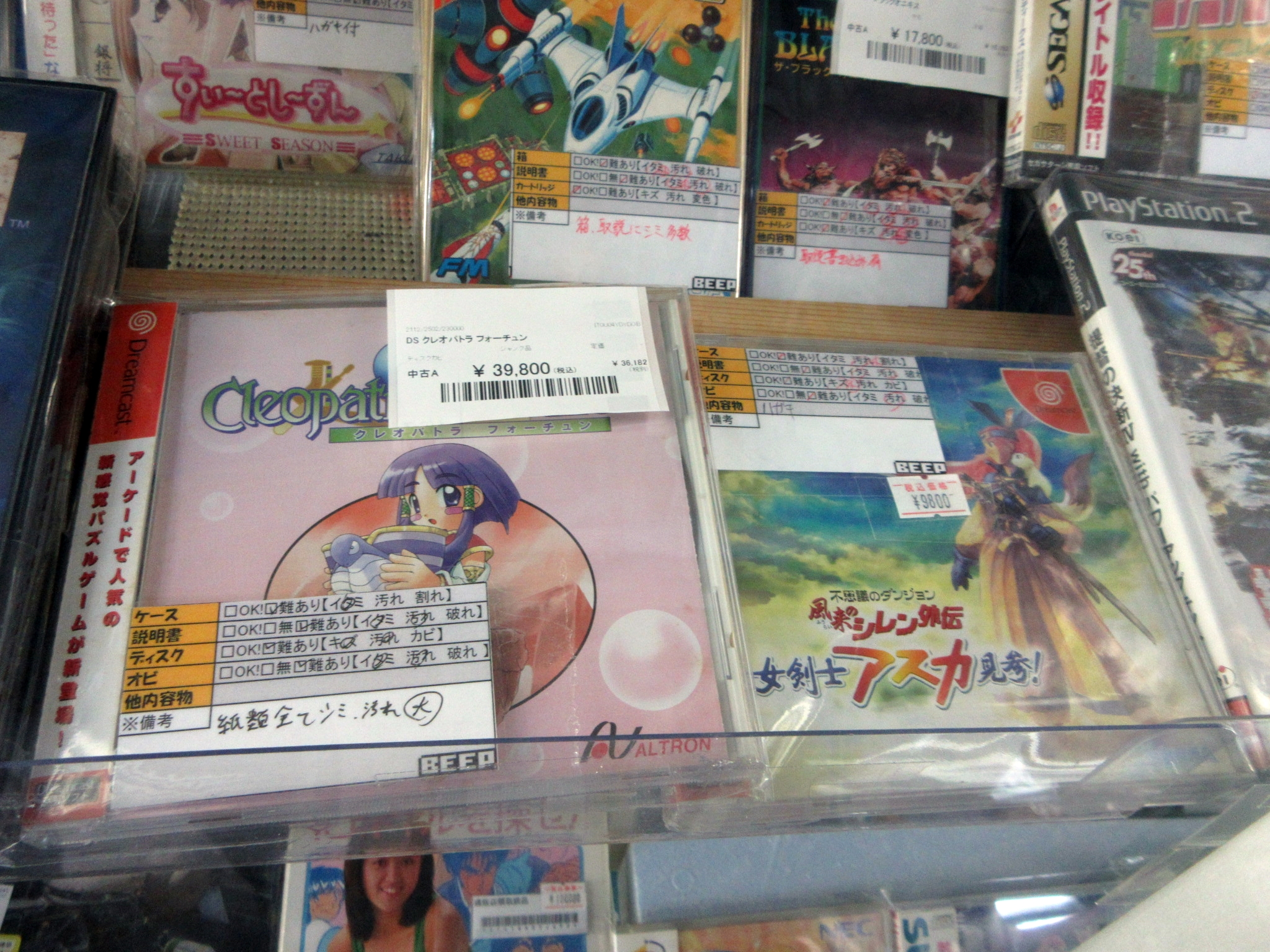 Left: Dreamcast games. I don't think I remember ever seeing Cleopatra Fortune. I have it for the Saturn. Right: monitors in the store demonstrated games running.