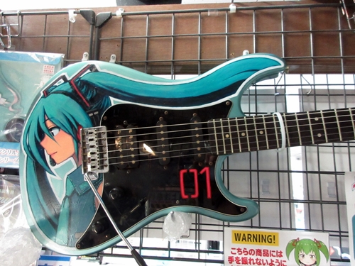 Left: this Hatsune Miku guitar looks cool. Right: when you are at the checkout counter, look up and you will see this stuff above you.