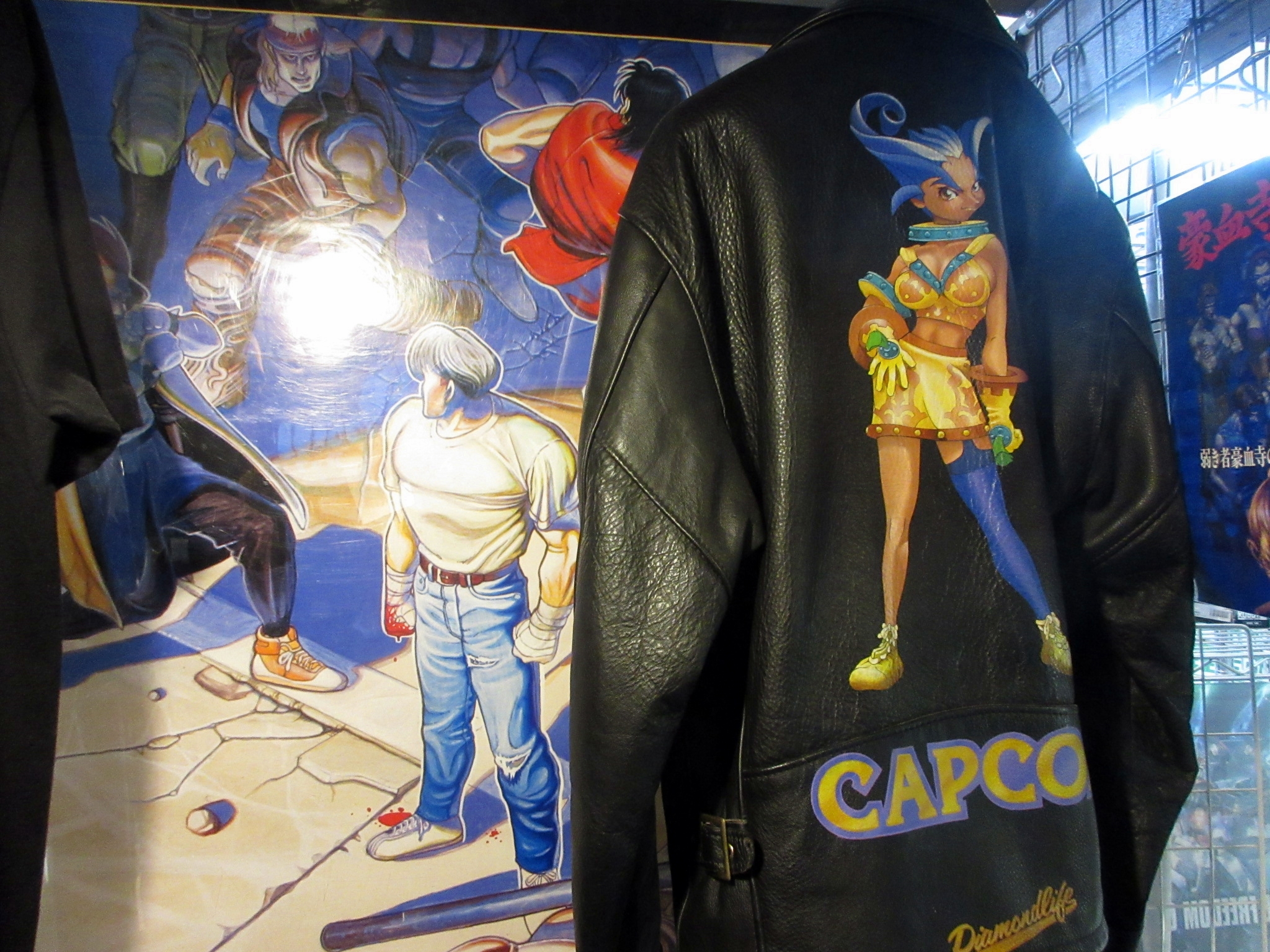 Left: some neat Capcom stuff with a poster for Final Fight and a leather jacket. Right: a Qix cocktail cabinet for sale!