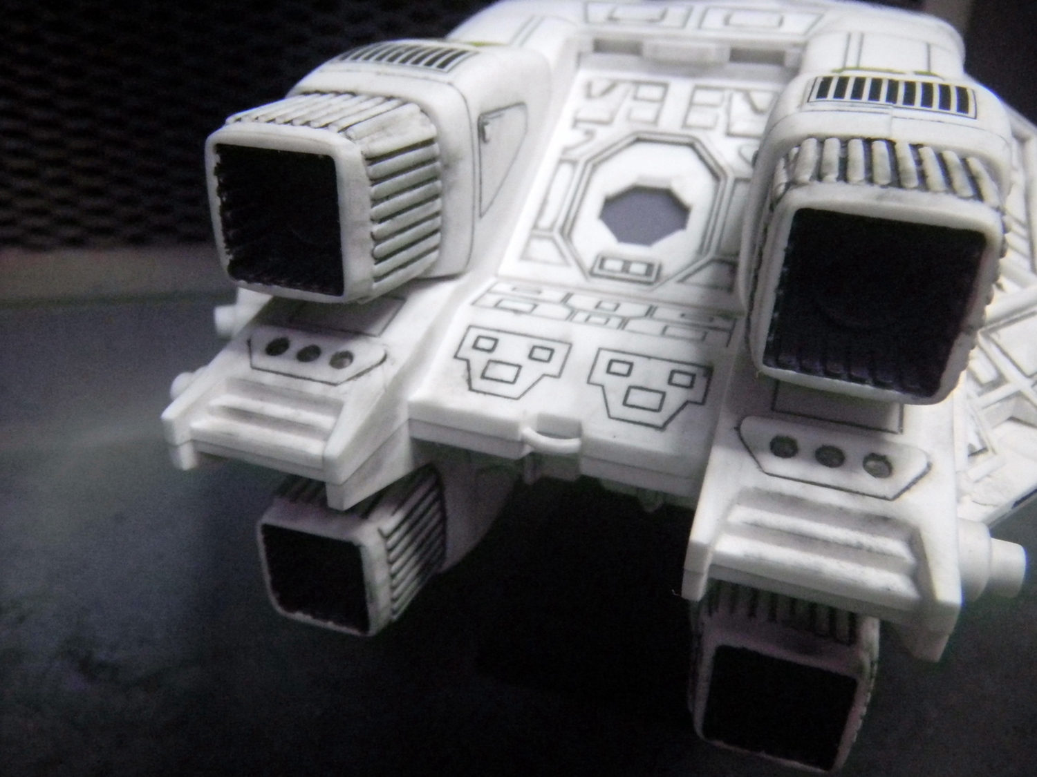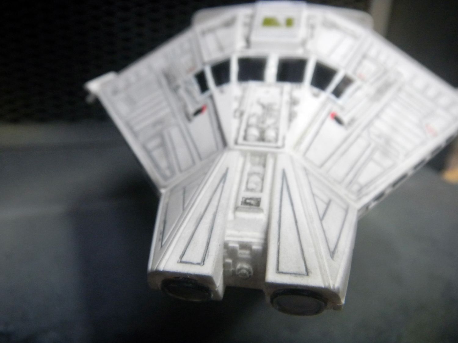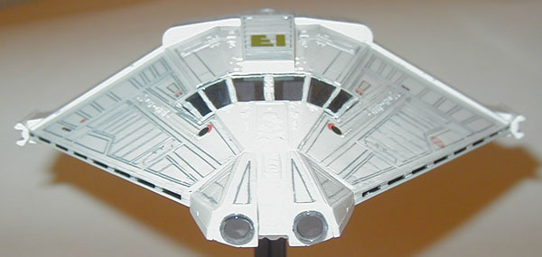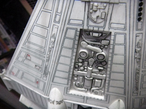 The Narcissus is my favorite ship from the Alien series. Yes, even more than the Sulaco. I just love this shuttle. But yes, the nose of this model is just as bad as the rumors say. But other than that, it really wasn't so bad to put together. I painted dark gray into all the cracks and wiped off the excess with a paper towel soaked in thinner, leaving only the paint in the cracks for detail. I really wish I knew about Gundam markers in November of 2005 when I built this model, because it would have made this a lot easier. I did not bother detailing anything inside the cockpit because the windows are so dark anyway that it wouldn't have made a difference. I wish I didn't bother putting on the red "EI" decals on the ship, because the Narcissus didn't have this in the movie anyway.