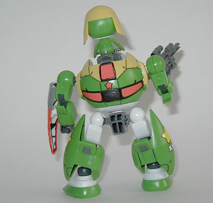 This is another easy model made for beginners. The box shows the trim around the shield to be the same color of green as Keroro and his robot, but I was way too lazy to do a paint job on the rest of the model just to make it match. So, I just used a Gundam Marker to paint it red. I used a black Gundam Marker to do the panel line detailing. I used a white Gundam Marker to finish up the robot's feet. This was my first time to use regular Gundam Markers for painting areas. Before I'd only used the fine tip Gundam Marker to do panel lines. Lastly, the stickers don't look shabby on the model at all.