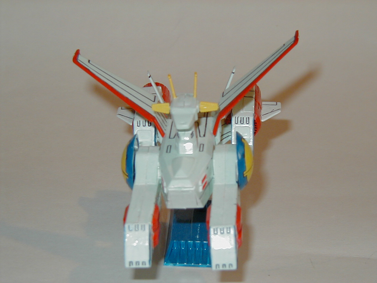 Unlike most other Gundam models, this is a model that certainly requires glue. This was my first attempt at completely hand-paiting a model, so I anticipated it not turning out very well. I painted it all in gloss enamel paints and didn't do anything fancy with it at all. Here is the result. Major lesson learned: when totally hand-painting the entire surface of such a model, it is important to prime the surface. The paint was more difficult to control on a slicker surface of the plastic right out of the box.