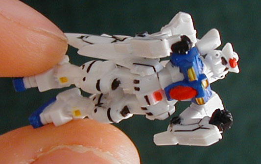 Not much painting was really necessary. I used the flat black enamel plus Zippo fluid trick to get the panel lines, and I used Testors Model Master Engine Gray to paint in the I-Field generator middle section. I also used Model Master Gun Metal to color the inside of the missile clusters. For the miniature GP03 Gundam unit, I used Gundam markers. I pressed them into a well to make the colors bleed out and I used a super fine tipped brush to get the details. Basic blue, red, black and yellow Gundam Markers were used. I was initially nervous about getting the minute details done, but I actually had fun painting the tiny little Gundam figure. Glue was definitely necessary for the Gundam.