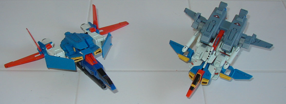 While the Zeta Gundam transforms into a "Wave Rider" mode, the ZZ Gundam actually splits off into separate two fighters. This is as close as Gundam gets to a "multiple vehicles combine into one robot" like Voltron or the Constructicons from Transformers. Judau is usually piloting a single Core Fighter, and he trades places with another Core Fighter to complete the transformation sequence. However, the show isn't like Voltron or Sailor Moon where the enemies just twiddle their thumbs while waiting for the heroes to transform. They have to wait for the opportunity to do so and even get pinned down by enemy fire that prevents them from forming the ZZ Gundam.