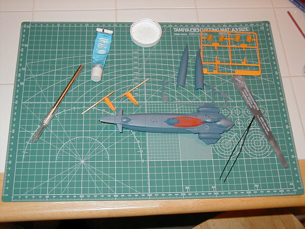 This is a very basic model of Captain Nemo's Nautilus from Fushigi No Umi No Nadia, with very few parts to assemble. Since I'm finally comfortable with using my new Paasche airbrush, this model is 95% airbrushed with Tamiya acrylic paints. The yellow parts are yellow paint with a touch of red to make it slightly orangish, the hull is blue with gray, the lighter parts have less blue, and the red top part is red with a bit of brown to darken it. The nose cones are actually hand-brushed red Testors enamel paint, the only hand-brushed part of the whole model.
