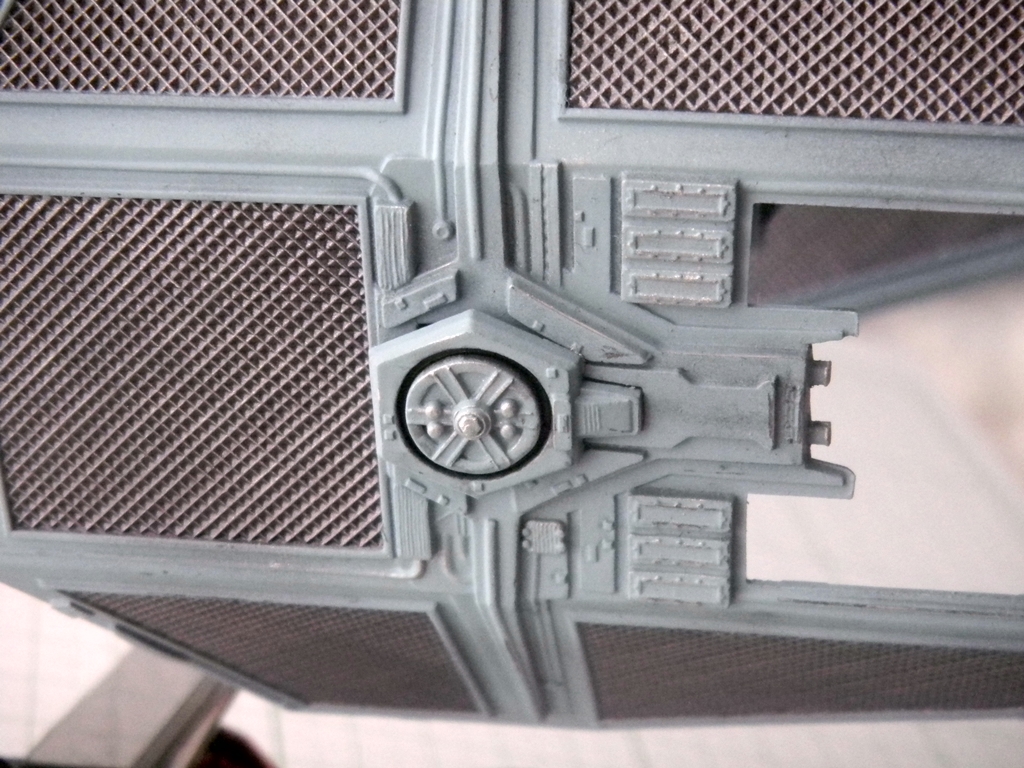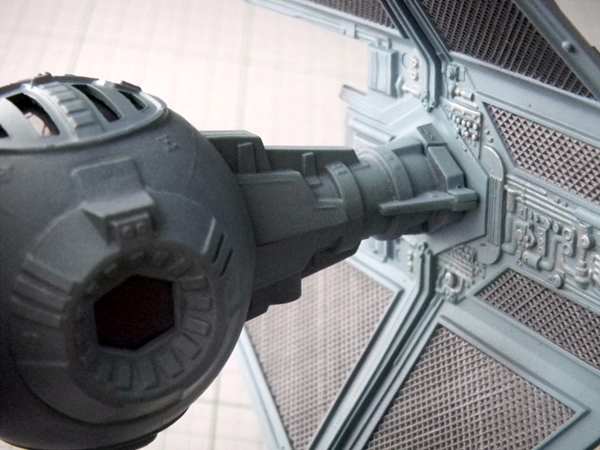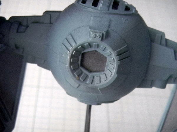 Well, speaking of accuracy, this TIE Interceptor model is fairly accurate, despite some flaws. The top hatch is actually not movable, and instead MPC thought that the back of the cockpit "ball" was where a hatch should be. I read somebody's post that originally, this may have been the idea behind the TIE Fighters, however with the Kenner TIE Fighter toy's hatch being on top, that changed the way that the hatch was conceived. Well, either way, this TIE Interceptor model has a hinged back door that looks pretty lousy if left alone. I glued and puttied it into place. I think I did a fairly good job at sanding the puttied area to make it look better.