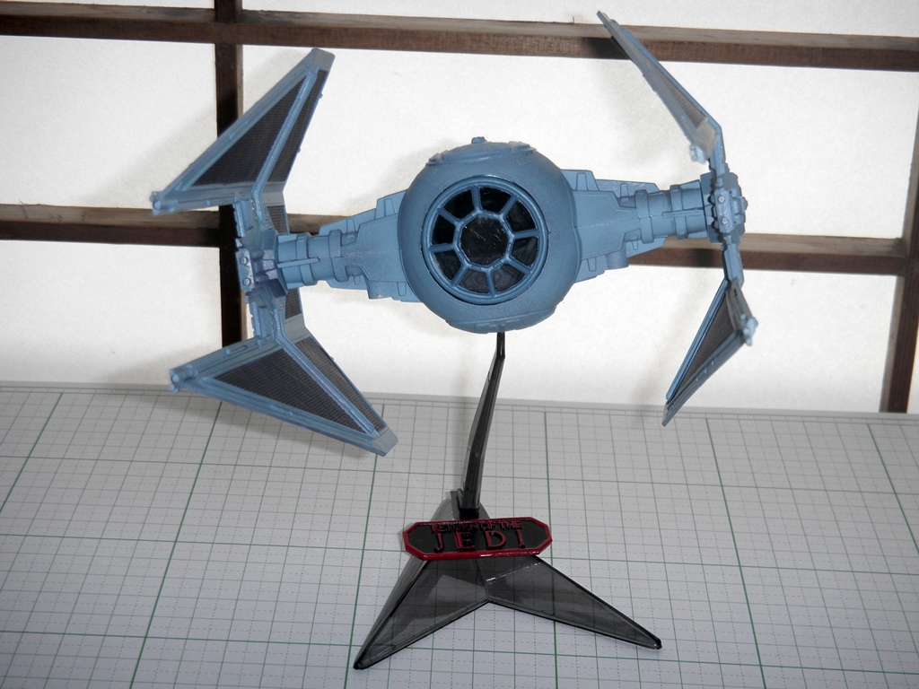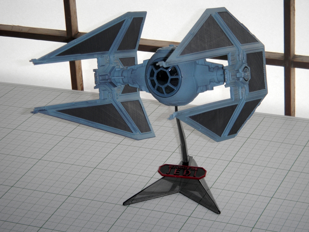 So after airbrushing, I noticed that there were a few areas where the application wasn't perfect, and the Gun Metal showed through slightly. I decided that to leave this alone, since it added a bit of flavor. At the same time, I didn't want to weather the model like I was weathering the Galaga starfighter model I was simultaneously working on. Traditionally, Imperial craft are not beat up and weathered like the "Rebel scum" craft are, since the Empire has the funding, personnel, and resources to upkeep their machinery more than the Rebel Alliance does. So I only did a very light application of drybrushing Testors Steel enamel in some places, and I applied some black artist's chalk very sparingly. Lastly, I spray painted the stand's "Return of the Jedi" plaque with Tamiya TS-40 Metallic Black and painted the lettering and border with Testors Red gloss enamel.