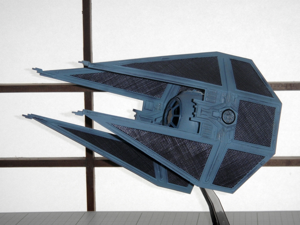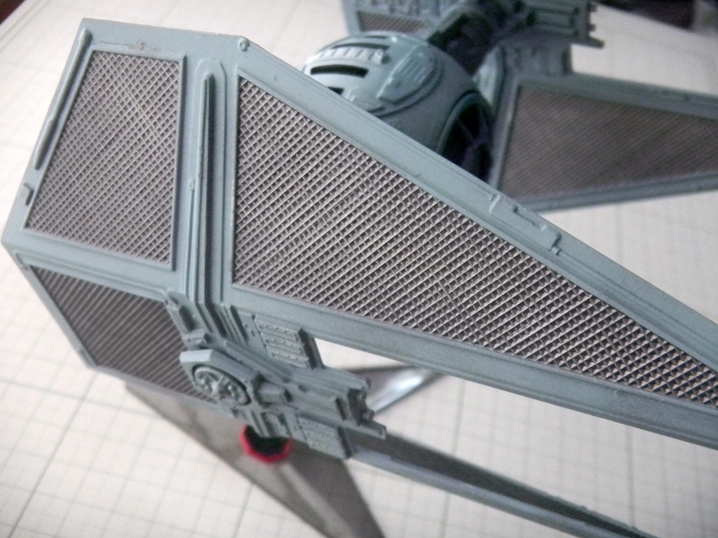 Other points of inaccuracy are the lack of laser cannons under the cockpit window (although I don't think it was ever established that those are actual cannons or just the mounts of cannons since that is where they are located on the regular TIE Fighter) and the lack of detail to the sides of the cockpit window. Other than that, there's some detail missing in the middle area of each solar panel (the actual Interceptor detail is a bit wider than what you get with this model). The nice thing is that the solar panels come molded solid and that there are few pieces to assemble.