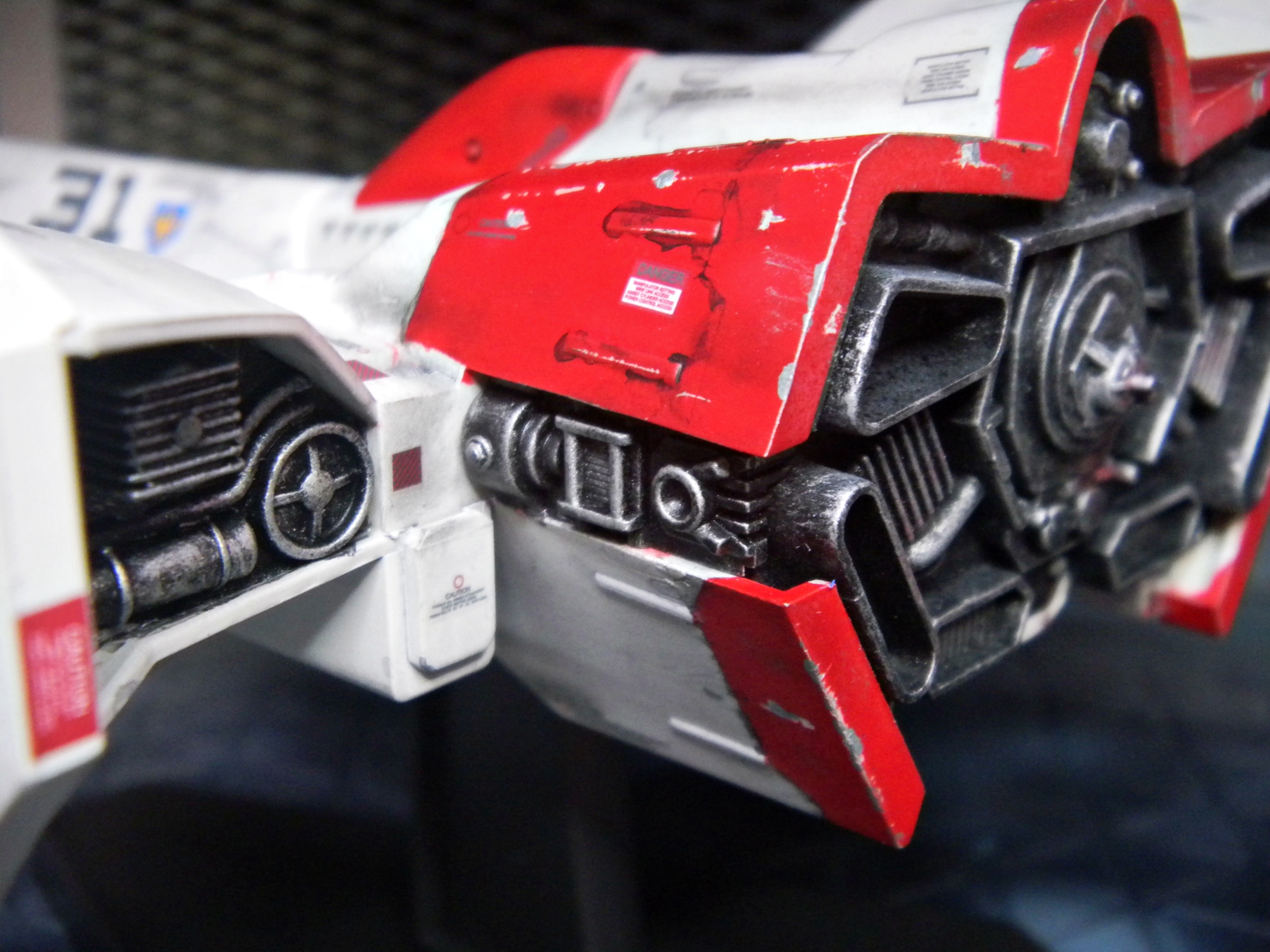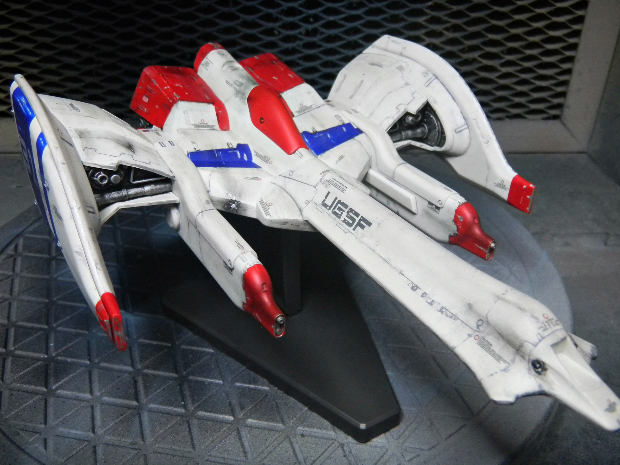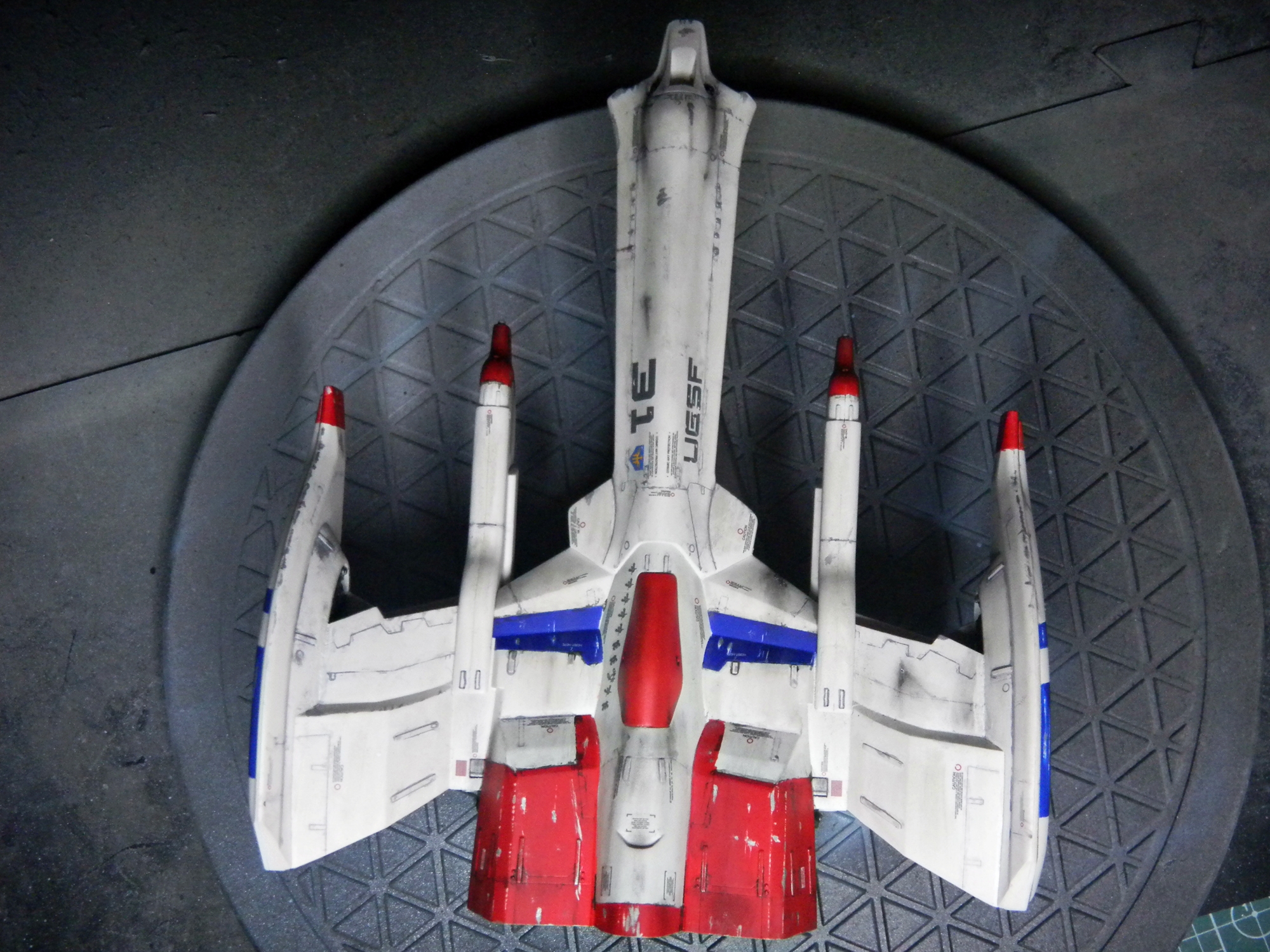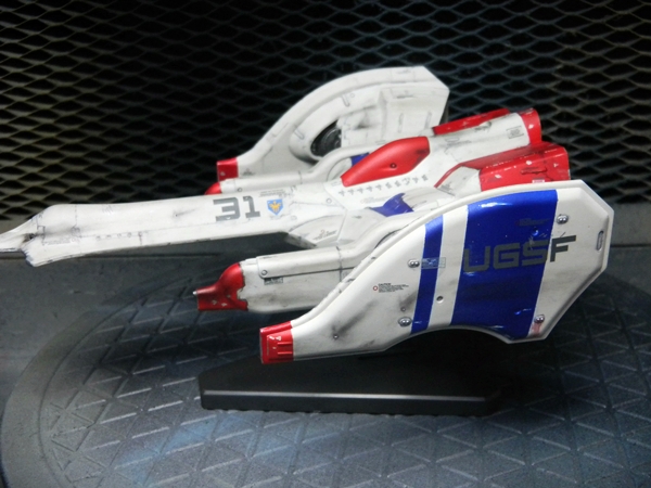 Panel lines were done by gray-colored Tamiya Panel Line Accent Color. I used the black version for the red and blue-colored areas. I used Testors silver enamel to drybrush the engines and create paint chips. The one cool thing about this model is the sheer amount of decals! Different retro video game-looking insignias can be chosen (VERY nice touch!) and I really like how the decals include those "kill marks" designating how many enemy bugs have been shot down. The paint scheme I chose was different than what the box suggested, with its splotchy gray-colored top coloring. I chose a paint scheme to make it closer to the game sprite. I envisioned this great space war with the Galaga aliens, with the "UGSF" ("United Galactic Space Force," I presume?) constantly outnumbered by these fierce swarms of attacking alien bugs. I pictured this fighter as only having its engines and weapons maintained, while it just looks dirty and beat-up. I have blast points as well as claw scratches on the hull.