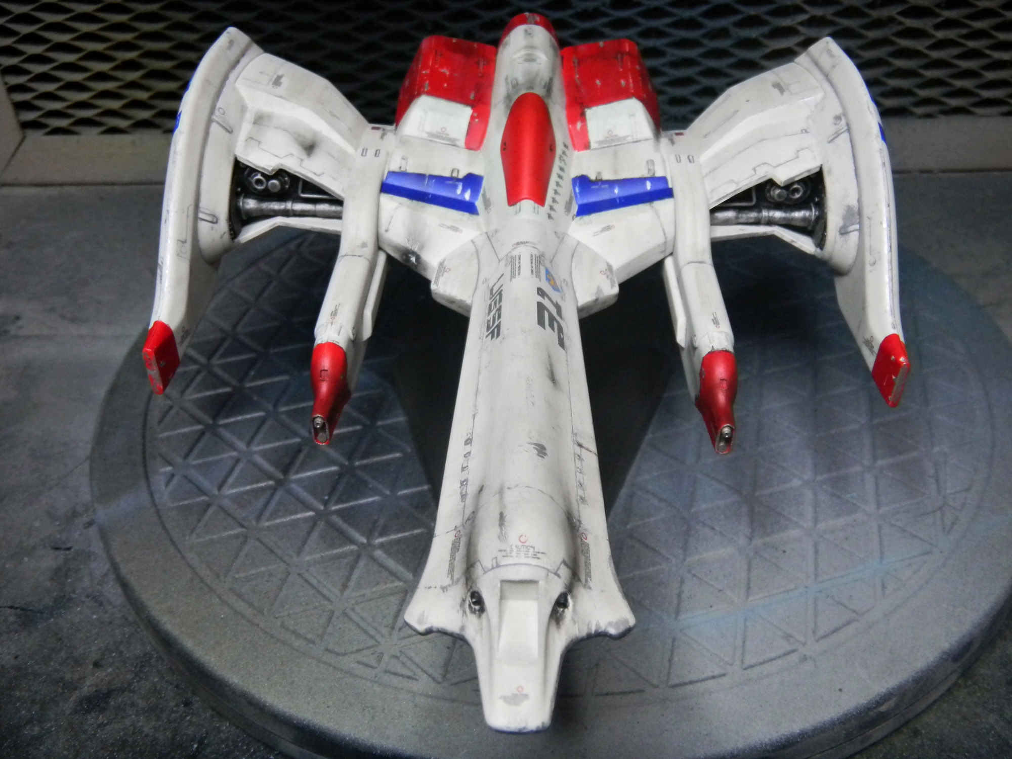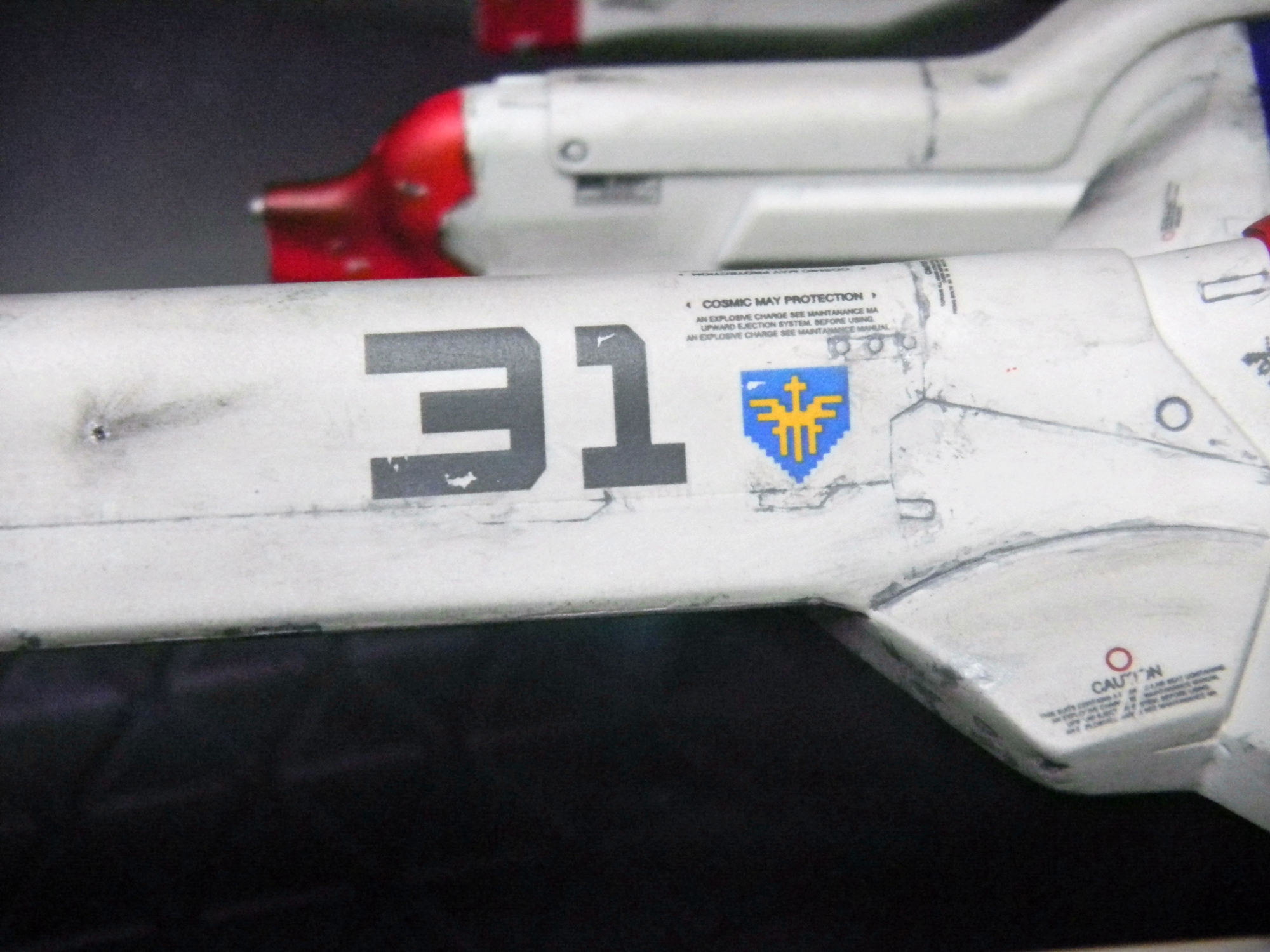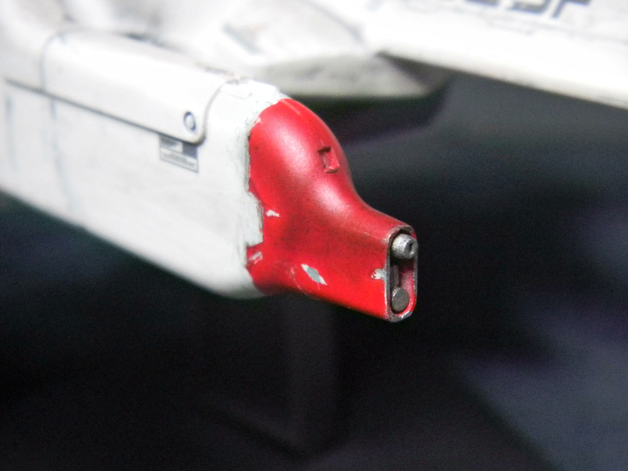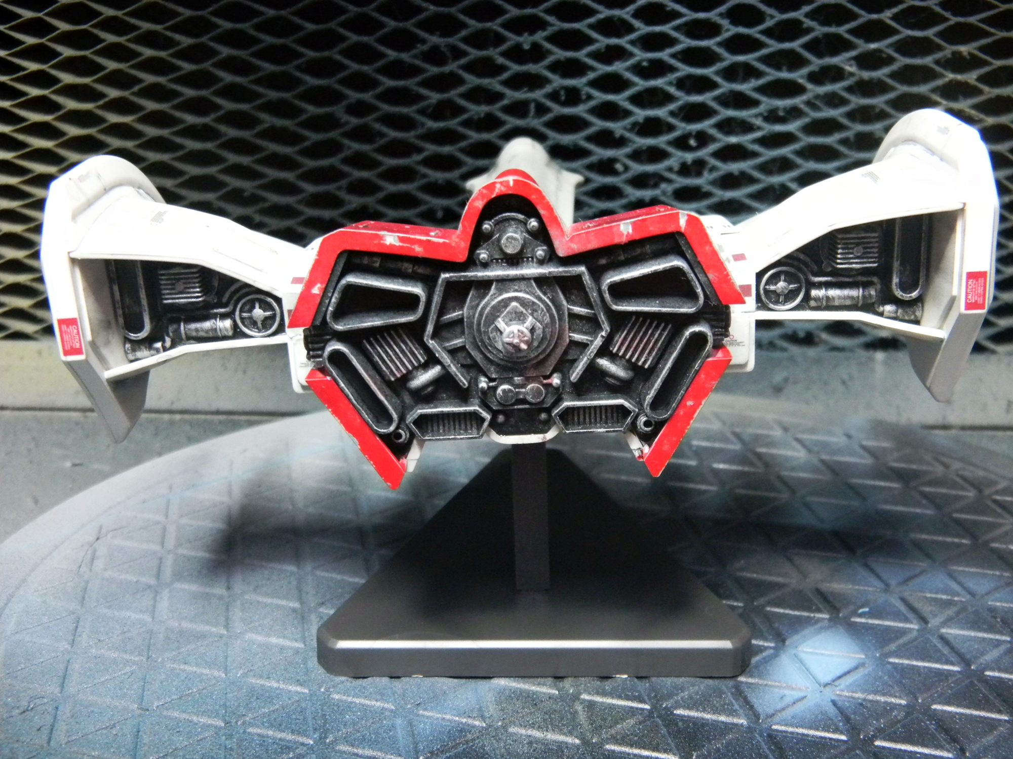 Panel lines were done by gray-colored Tamiya Panel Line Accent Color. I used the black version for the red and blue-colored areas. I used Testors silver enamel to drybrush the engines and create paint chips. The one cool thing about this model is the sheer amount of decals! Different retro video game-looking insignias can be chosen (VERY nice touch!) and I really like how the decals include those "kill marks" designating how many enemy bugs have been shot down. The paint scheme I chose was different than what the box suggested, with its splotchy gray-colored top coloring. I chose a paint scheme to make it closer to the game sprite. I envisioned this great space war with the Galaga aliens, with the "UGSF" ("United Galactic Space Force," I presume?) constantly outnumbered by these fierce swarms of attacking alien bugs. I pictured this fighter as only having its engines and weapons maintained, while it just looks dirty and beat-up. I have blast points as well as claw scratches on the hull.