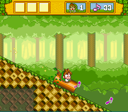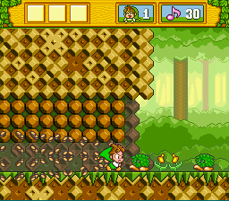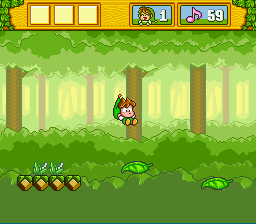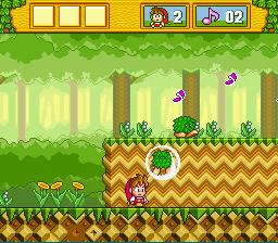 The in-game graphics are very crisp and detailed. Very cute and charming. There's not a lot of parallax scrolling or anything spectacular like that, but the presentation is very sharp and well animated. There are small details to notice, like how the faces on the tree stumps turn grumpy when you stand on them. When Milon falls to far below, his eyes jump out of their sockets in that cartoony delayed moment right before the law of gravity kicks in. Also you'll notice how Milon jumps: when he reaches the height of his jump, he does this cute little flip in the air.