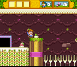 Unlike its prequel, DoReMi Fantasy: Milon's Exciting Adventure is a straightforward platformer. As it has been described in reviews elsewhere, the gameplay is a mixture of Super Mario Brothers and Sonic the Hedgehog. You can jump on enemies Mario-style by pressing B, but this only stuns them momentarily. To properly dispatch them, you must press Y which makes Milon blow a bubble. The enemy is trapped in the bubble, and touching them will send the bubble flying off-screen. If they knock into another baddie, they will go flying away too. Pressing and holding Y will charge a super attack, in which upon release Milon will launch several bubbles in different directions. The comparison to Sonic the Hedgehog does not come from the game's speed, but rather from the springboards that will send Milon busting through blocks and walls. In the sweets world, champagne corks launch Milon into the air at 45 degrees to bust through blocks.