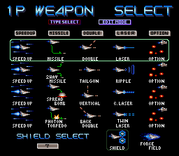 Who doesn't know Gradius? I almost feel embarassed to explain the gameplay. A side-scrolling shooter, powerups are collected after shooting yellow enemies or a chain of enemies. The powerups are on a point system, so you can save up these powerups to obtain speed ups, missles, more powerful firepower, options, and shields. Before you begin your game, you can choose your powerup configuration from some preset choices or customize your own. For example, you can choose between the laser, ripple, or double laser.
