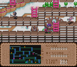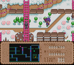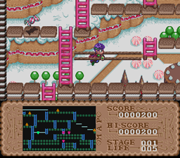 Lode Runner Twin is essentially the same game as the original, but with cute anime-type characters in a sugary dessert wonderland. The main screen shows a closeup view of your character, but there is a "radar screen" of sorts at the bottom center of the screen to give you a full view of what's going on. You control either the boy or the girl collecting candies and avoiding the little devils. You can dig a hole to the right or the left of your character in which to trap your enemies. Eventually the hole will close, and if you can trap a devil in the hole and time it just right to close up when they're still inside it, you will get bonus points. But be careful, you too can fall into these holes. Once you collect all of the goodies, a ladder at the top of the screen will appear and you will then climb up to exit the level.