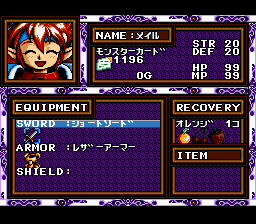 Originally on the NEC PC-99/98, Popuru Meiru has also been ported to the PC Engine and the Sega CD. This port to the Super Famicom is one of the few ports that Falcom themselves have been involved with, so purists should have no complaints. The Sega CD version was released as "Popful Mail" in English by Working Designs. Working Designs was both a blessing and a curse: they released many great JRPGs and other games from Japan that other companies would not have considered doing so and as a result we have the legendary Lunar series released in English, but at the same time they couldn't resist messing around with the games' programming to raise the games' difficulty levels, such as Treasure's Silhouette Mirage. They made Popful Mail brutally unforgiving by increasing the amount of damage you take from enemies, causing English gamers to constantly save their game's progress. For the original Japanese version, the voice actress for Mail is Megumi Hayashibara, thus causing plenty of comparisons of Mail to Lina Inverse of the anime Slayers.