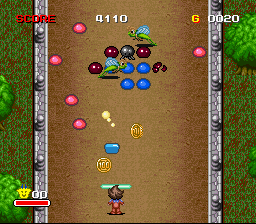 OK, so I admit, I haven't really spent much effort trying to read the Japanese text in this game, but apparently Tom crash lands from space in Zig Zag Land or something, and those three buffoons act as your nemesis in the game. I'm sure you won't be able to murder these three doorknobs, but you do get to kill bugs, pigs, cows, and other stuff that gets in your way. You have a cat (a Zig Zag Cat, apparently) that morphs into your ball. The B button accelerates your speed if necessary, while the A button throws your paddle ball forward. I like this feature, and it kind of reminds me of those paddle games on the Atari 2600 like Olympics or something. The right shoulder button activates your special items, such as when you collect the gun powerup.